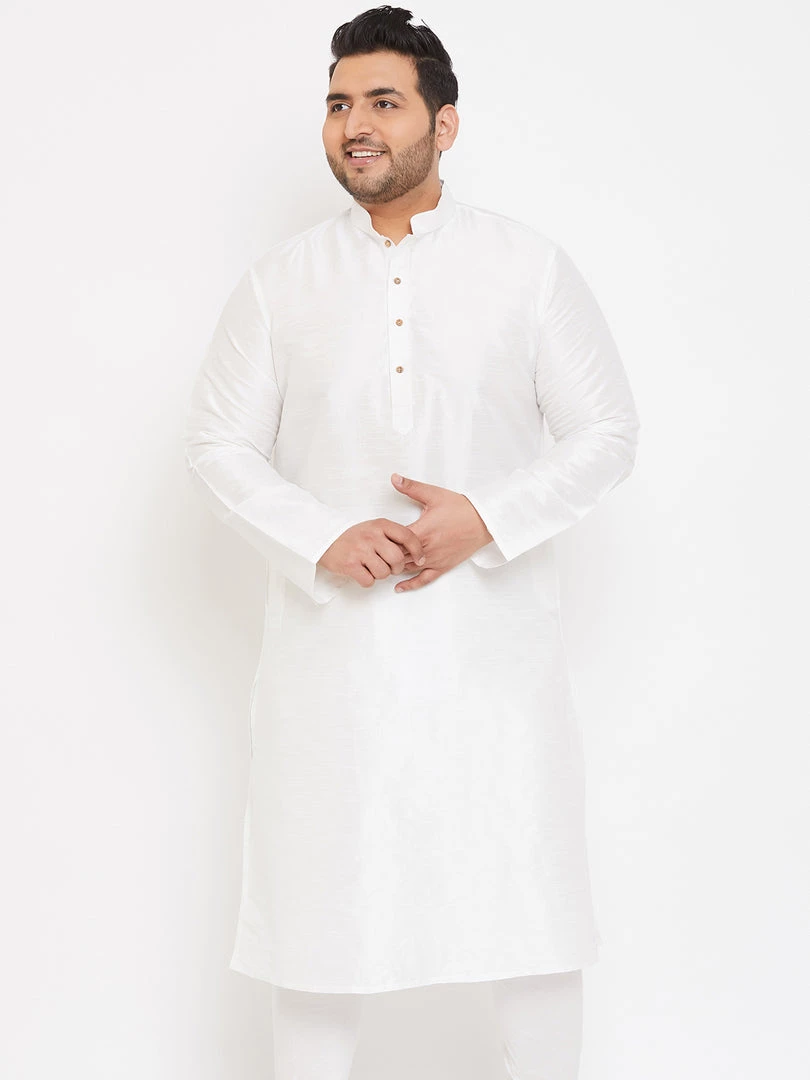 White straight kurta, has a mandarin collar, long sleeves, button placket, straight hem, and side slits