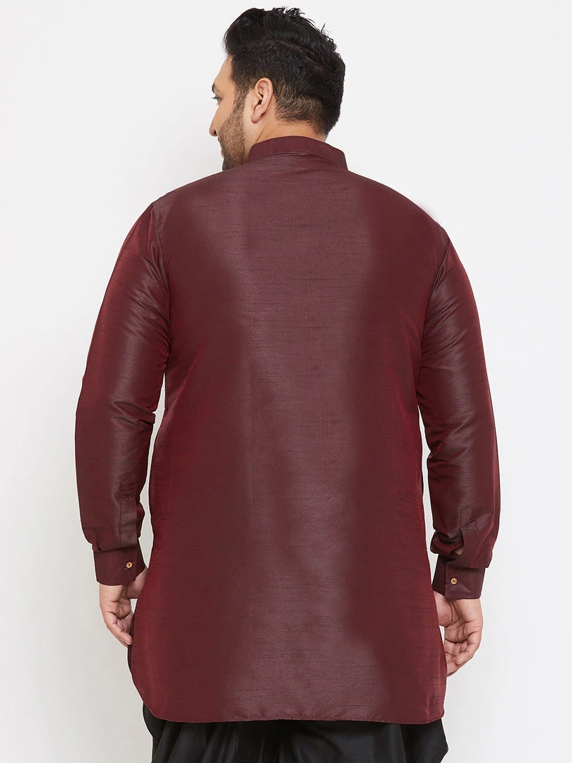 Wine straight above knee length kurta, has a mandarin collar, long sleeves with cuffs, button placket, curved hem, and side slits