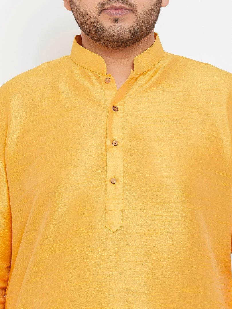 Yellow solid knee length straight kurta, has a mandarin collar, long sleeves, button placket, Straight hem, side slits