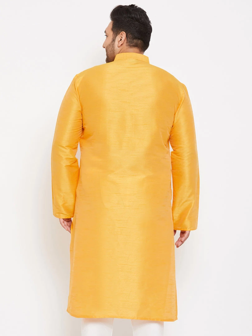 Yellow straight kurta, has a mandarin collar, long sleeves, button placket, straight hem, and side slits