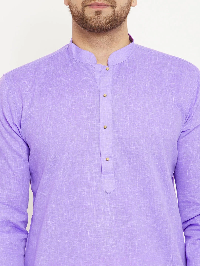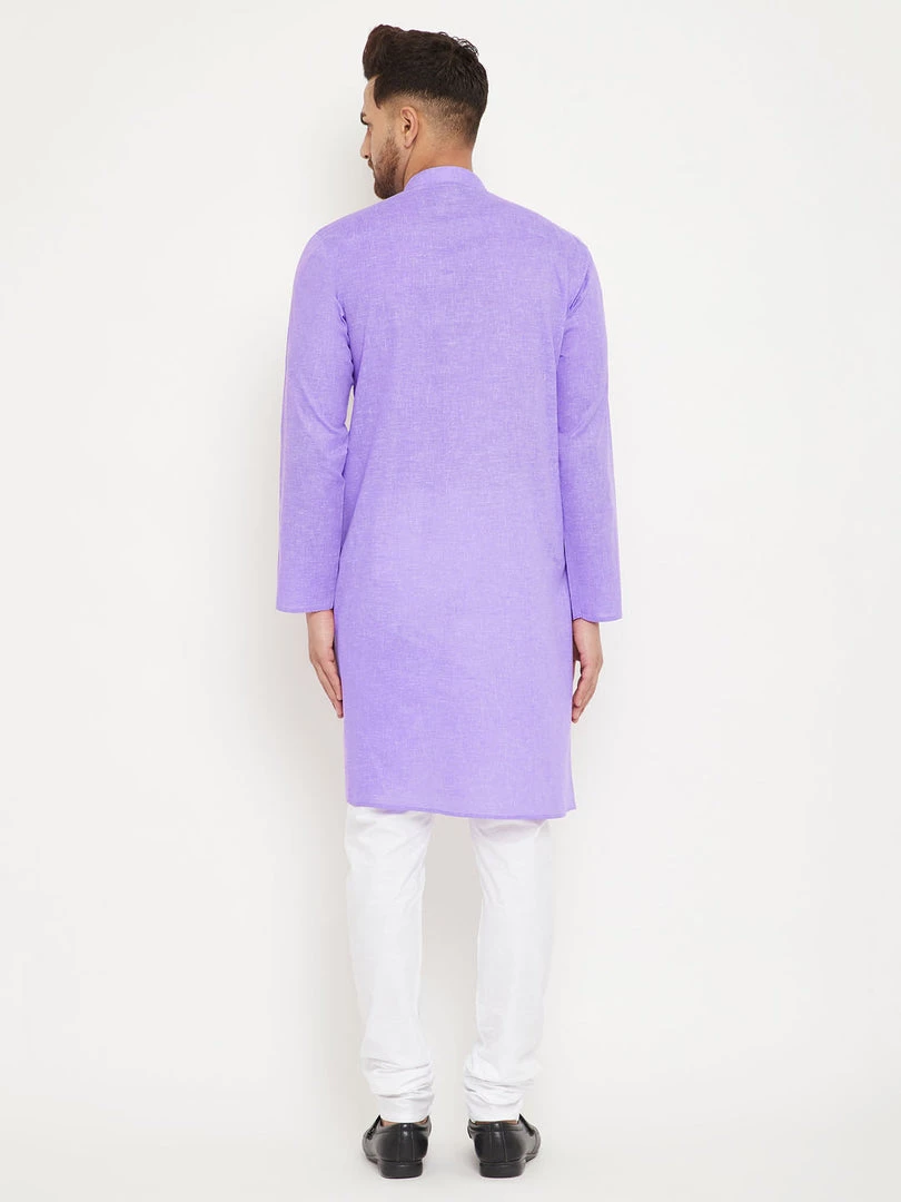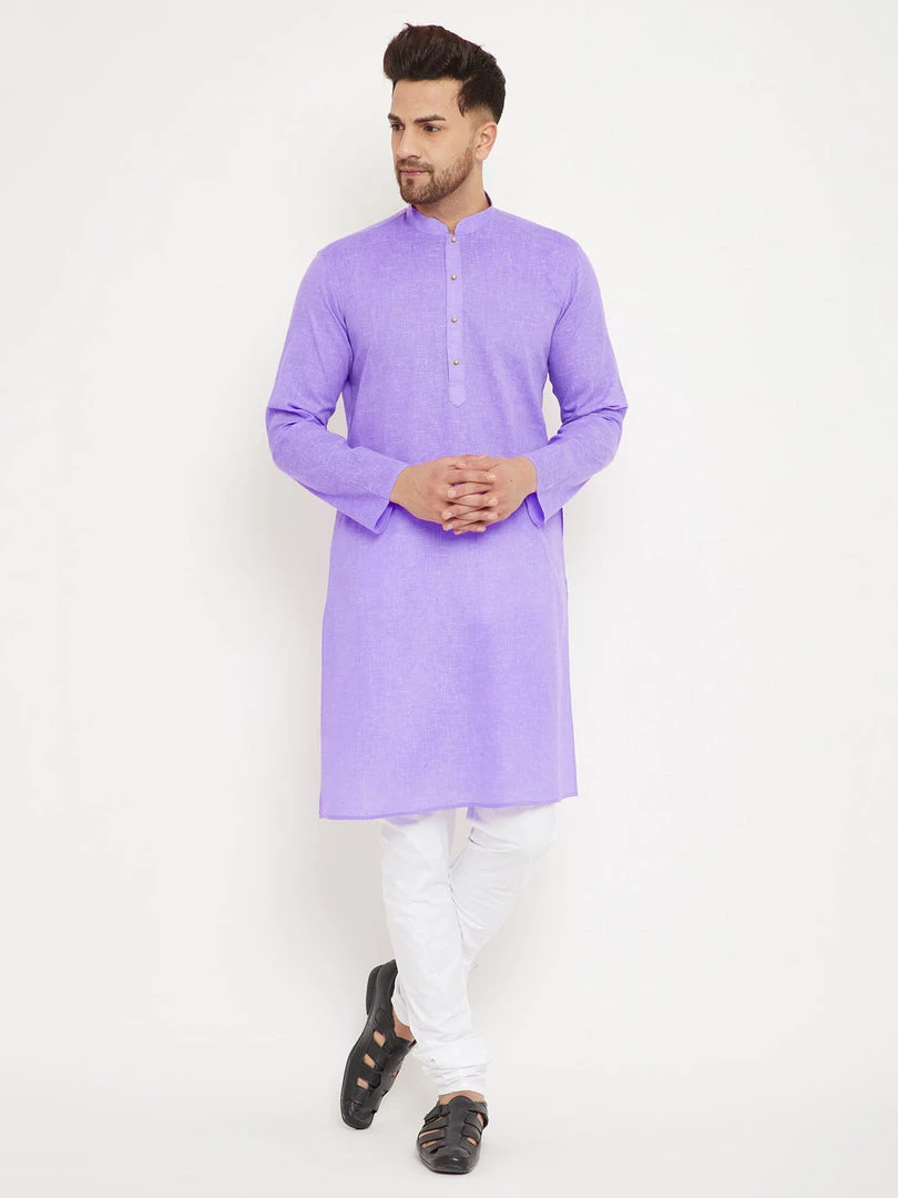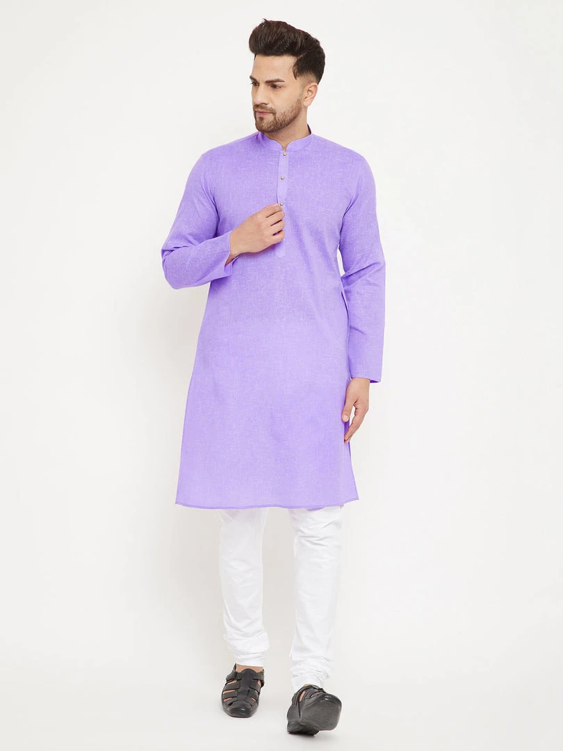Purple solid straight knee length kurta, has a mandarin collar, long sleeves, button placket, straight hem.