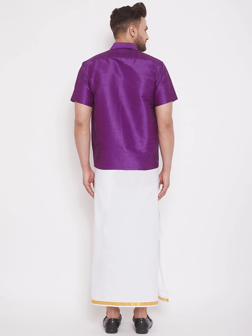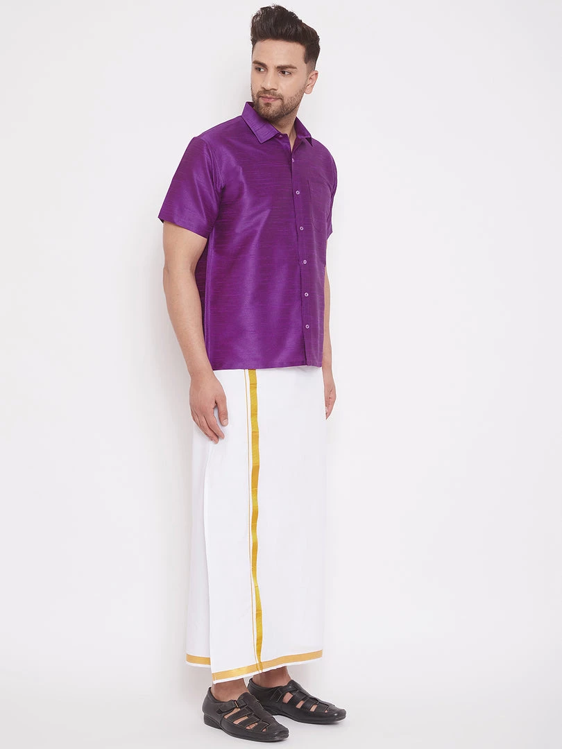 Vastramay brings to you this stylish South Indian style ethnic half sleeves shirt and ready-to-wear mundu vesty style dhoti pant set for. These are perfect relaxed shirts for any occasion including Festivals, ceremonies, Weddings, and Birthday parties. Popularly worn in South India on Vesty Mundu Dhoti along with an Angavastram.