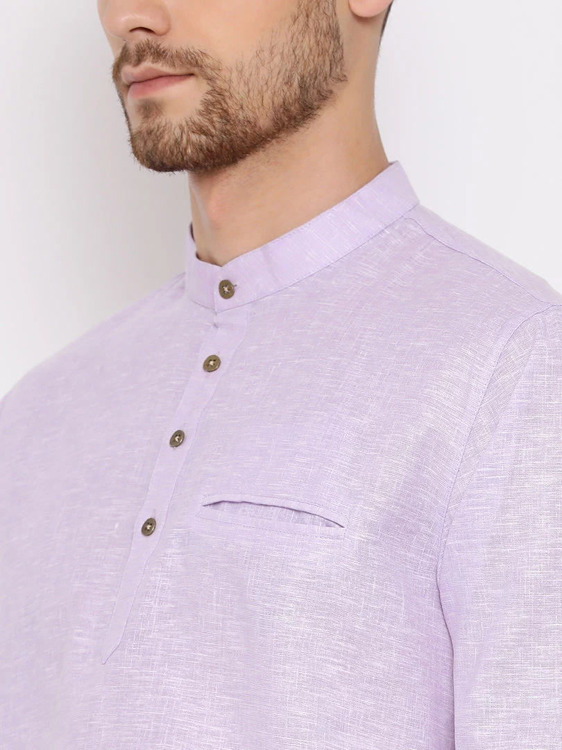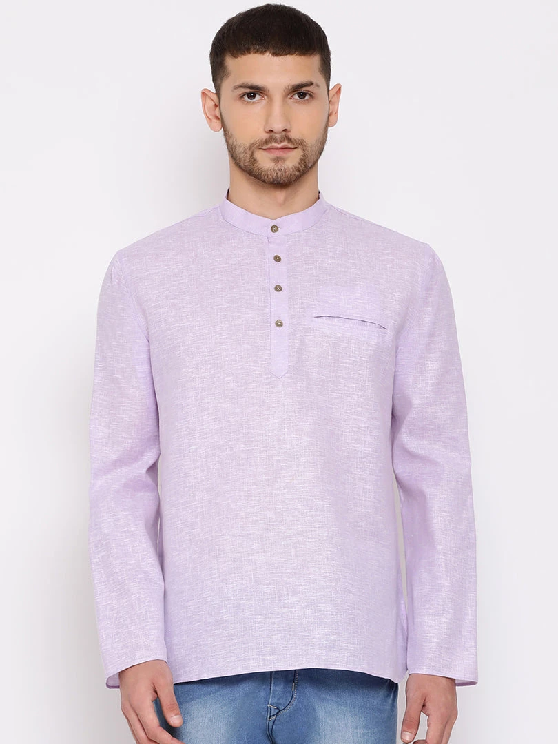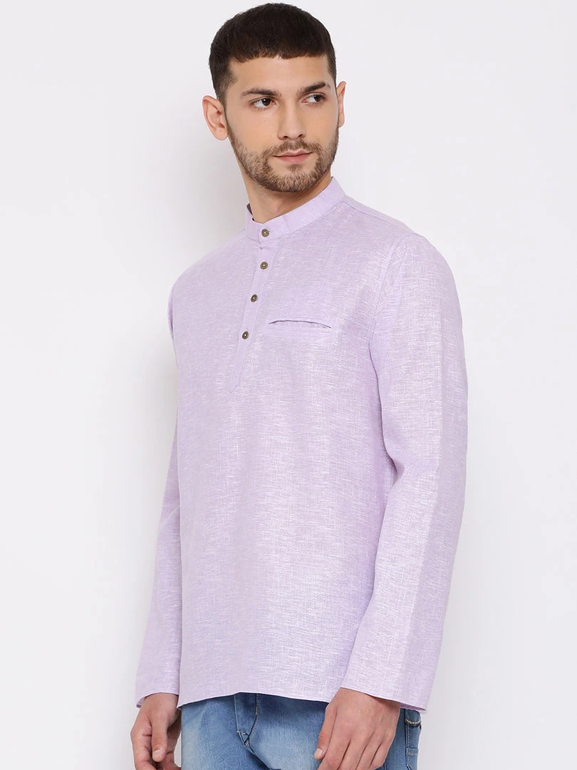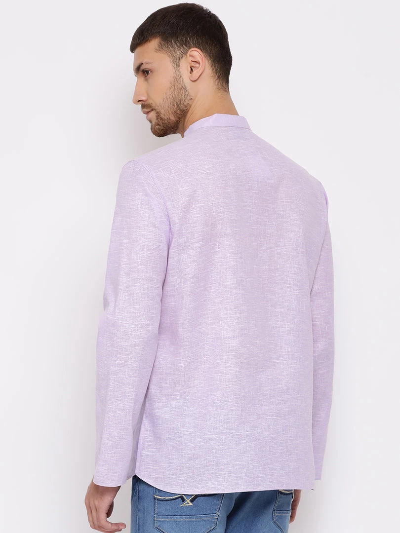 Purple solid kurta, has a mandarin collar, long sleeves, straight hem, button placket and a pocket