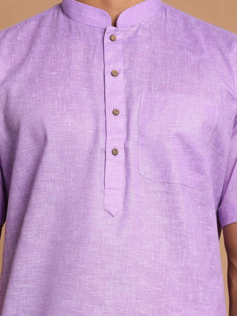 Purple solid above knee length kurta, has a mandarin collar, button placket, short sleeves and side slits