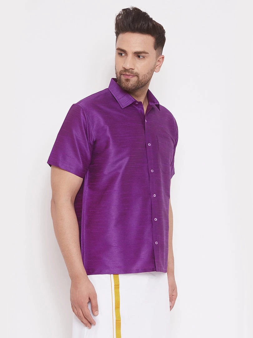 Purple solid casual shirt, has a shirt collar, short sleeves, straight hem, full button placket, one patch pocket