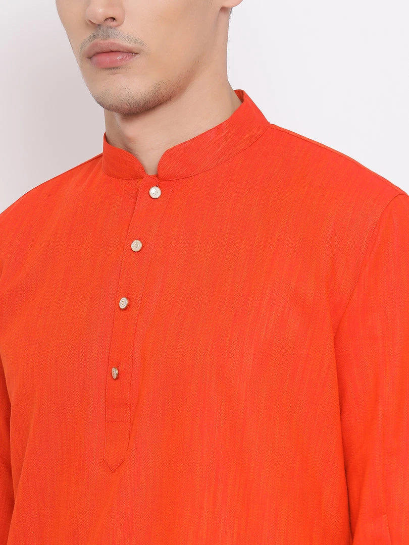 Red solid above knee length pathani kurta, has a mandarin collar, long sleeves with cuffs, button placket, curved hem and side slits