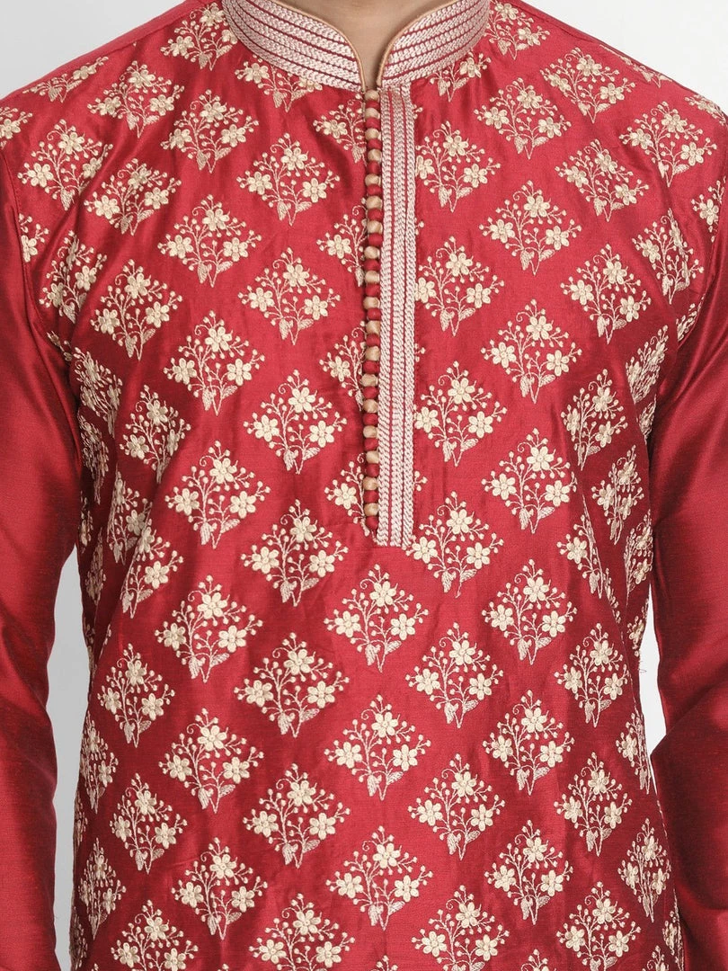 Red and beige embroidered straight knee length kurta, has a mandarin collar, button placket, long sleeves, straight hem