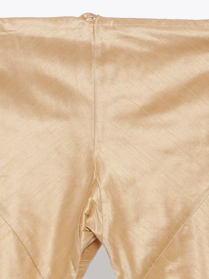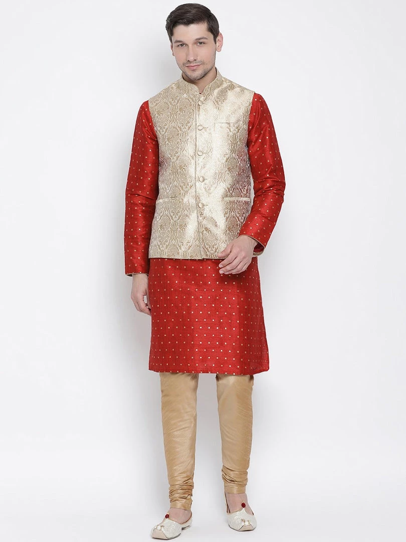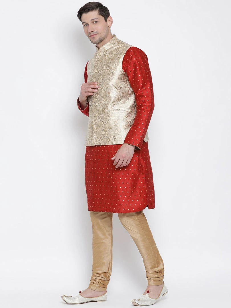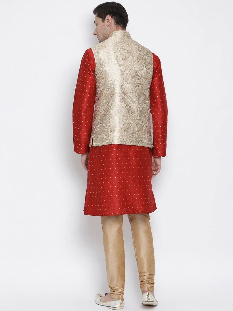 Red and gold woven kurta with solid churidar and beige Nehru jacket