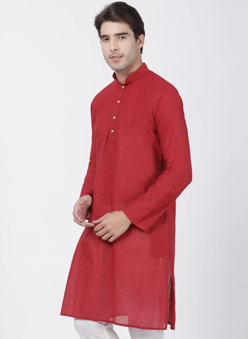 Red and black stripe woven straight knee length kurta, has a mandarin collar, button placket, long sleeves, straight hem.