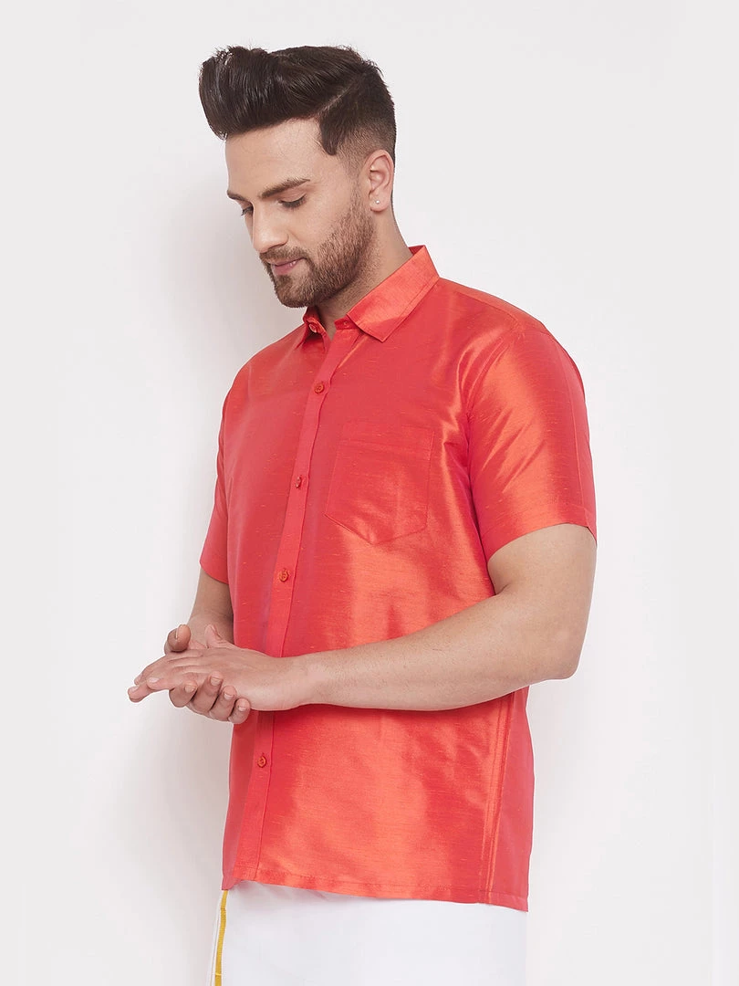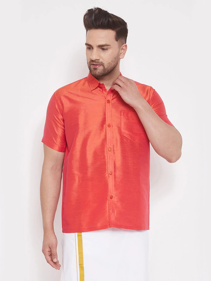 Red solid casual shirt, has a shirt collar, half sleeves, straight hem, one patch pocket