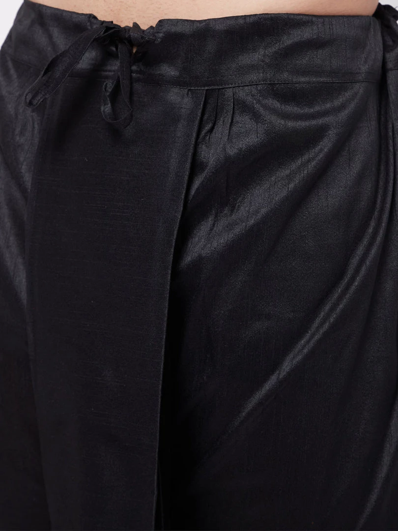 Black solid silk blend traditional dhoti has a waistband with a drawstring closure.