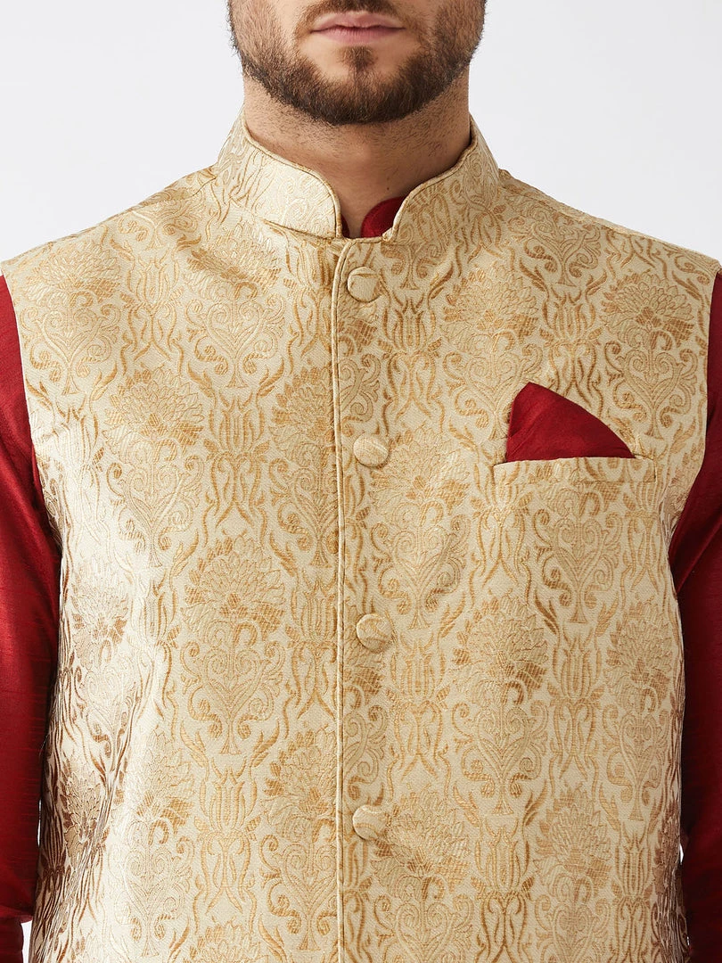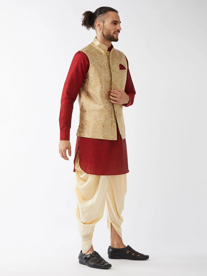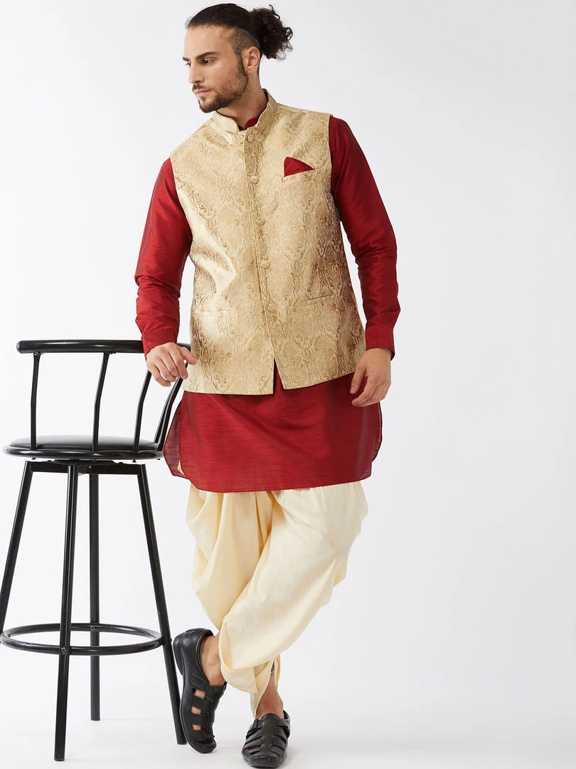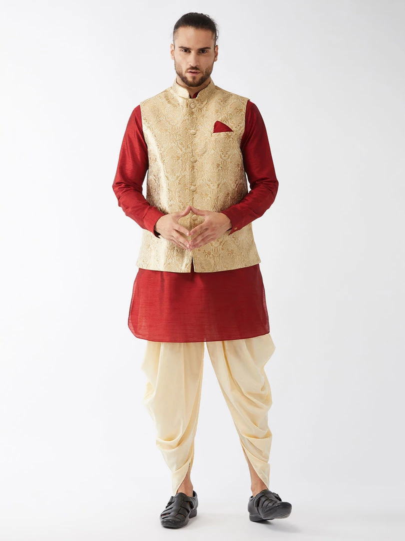 Maroon Solid kurta with dhoti pants and Rose Gold colored woven Nehru jacket