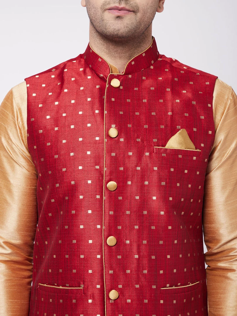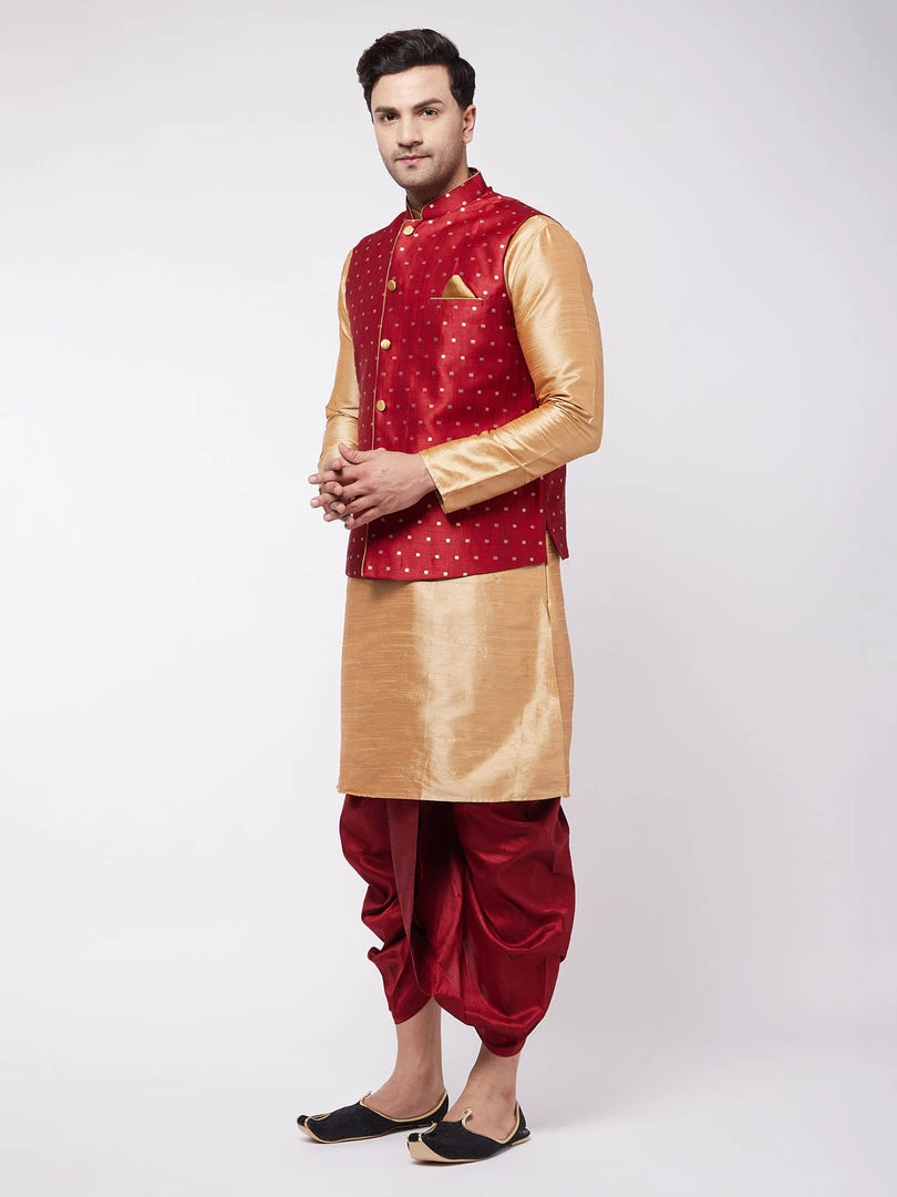 Rose Gold Solid Kurta With Maroon Solid Dhoti And Maroon Woven Nehru jacket