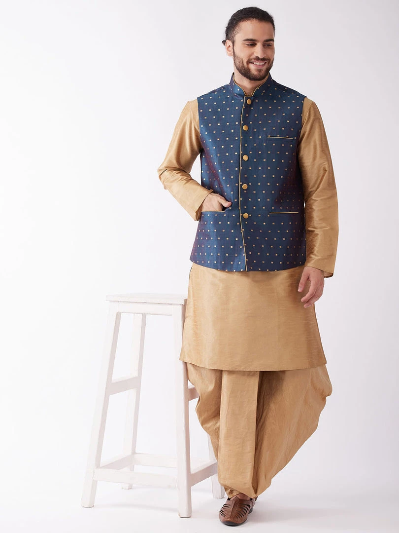 Gold-toned kurta with Dhoti and Blue woven Nehru jacket