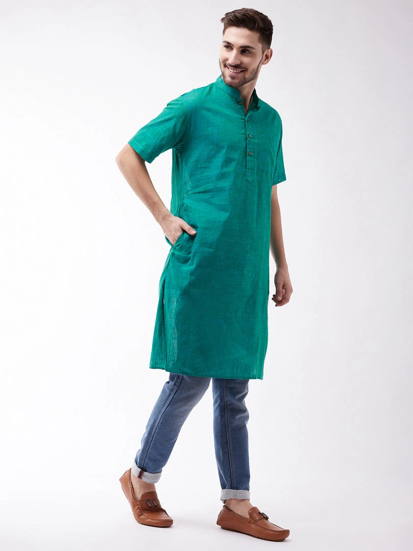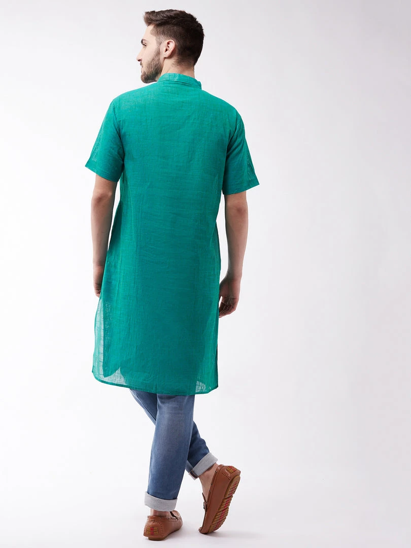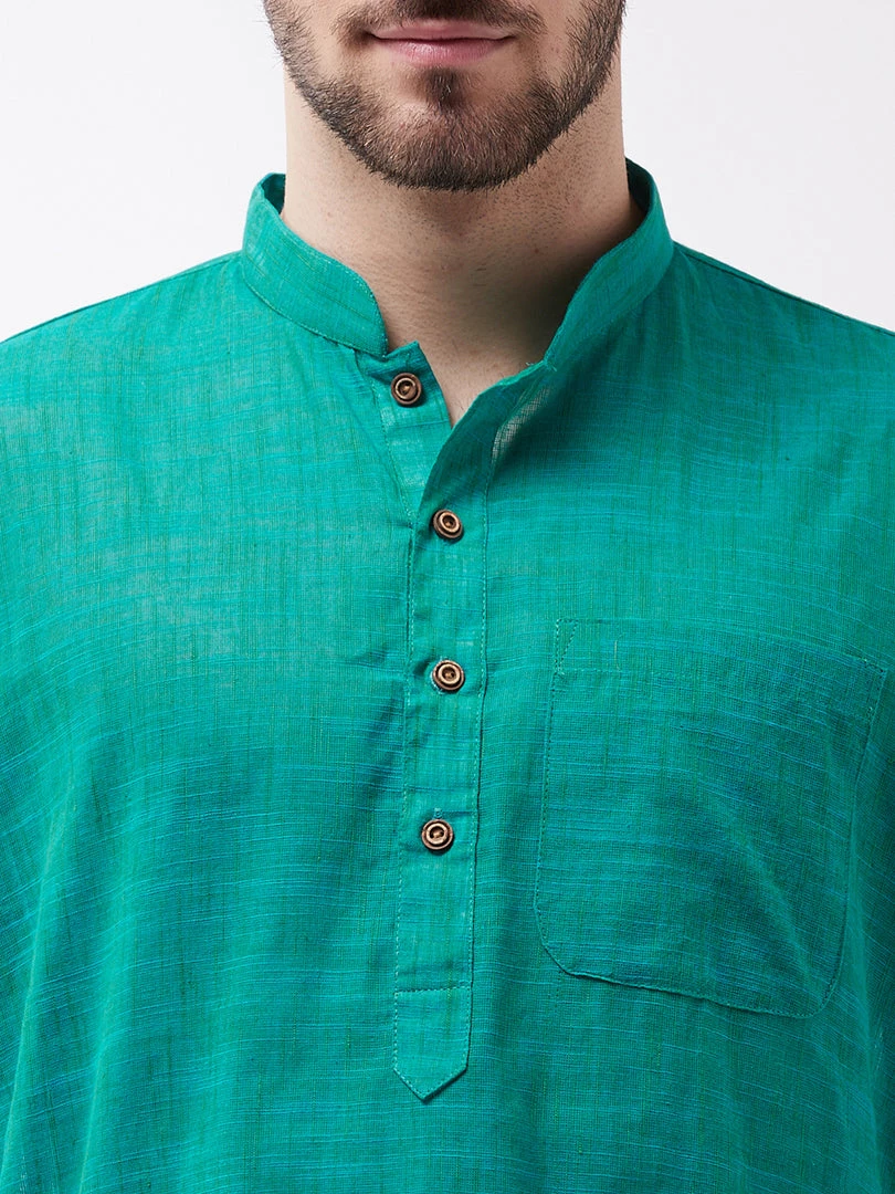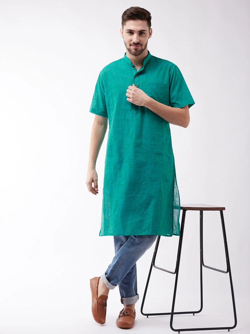 A Handloom Pure South Cotton straight kurta, has a mandarin collar, half sleeves, straight hem, and side slits