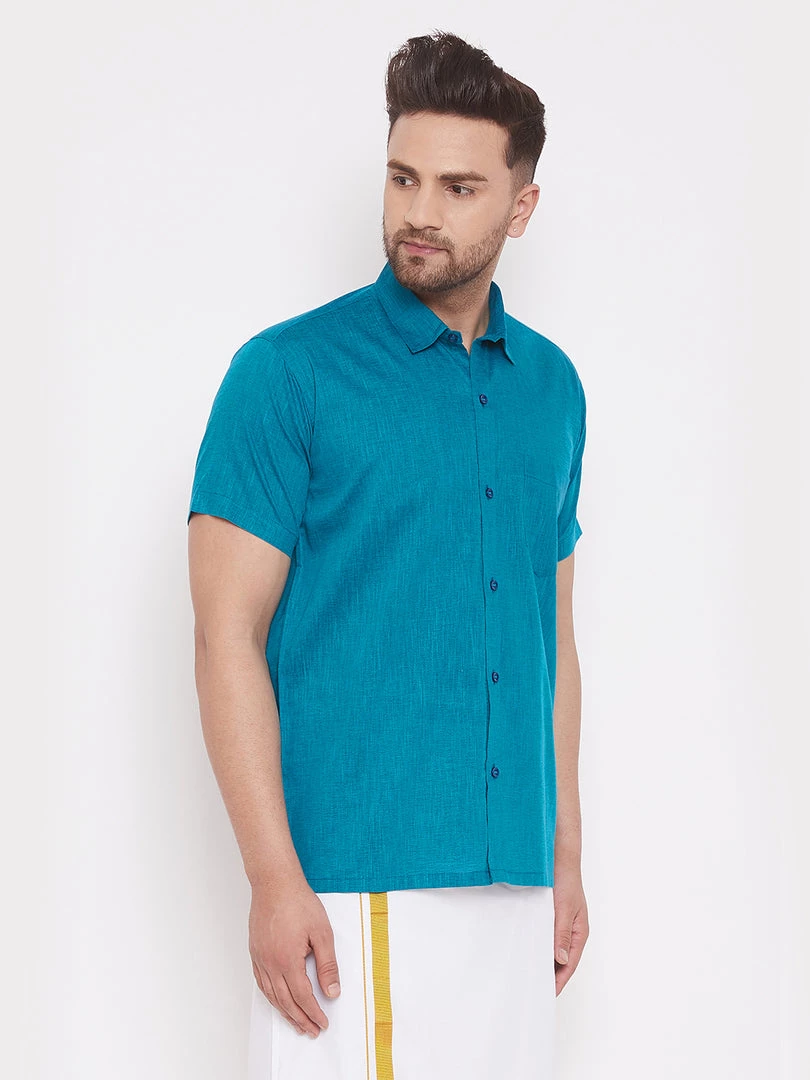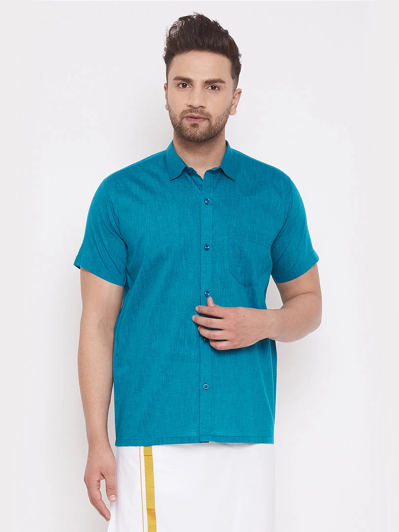 Turquoise solid casual shirt, has a shirt collar, half sleeves, straight hem, one patch pocket