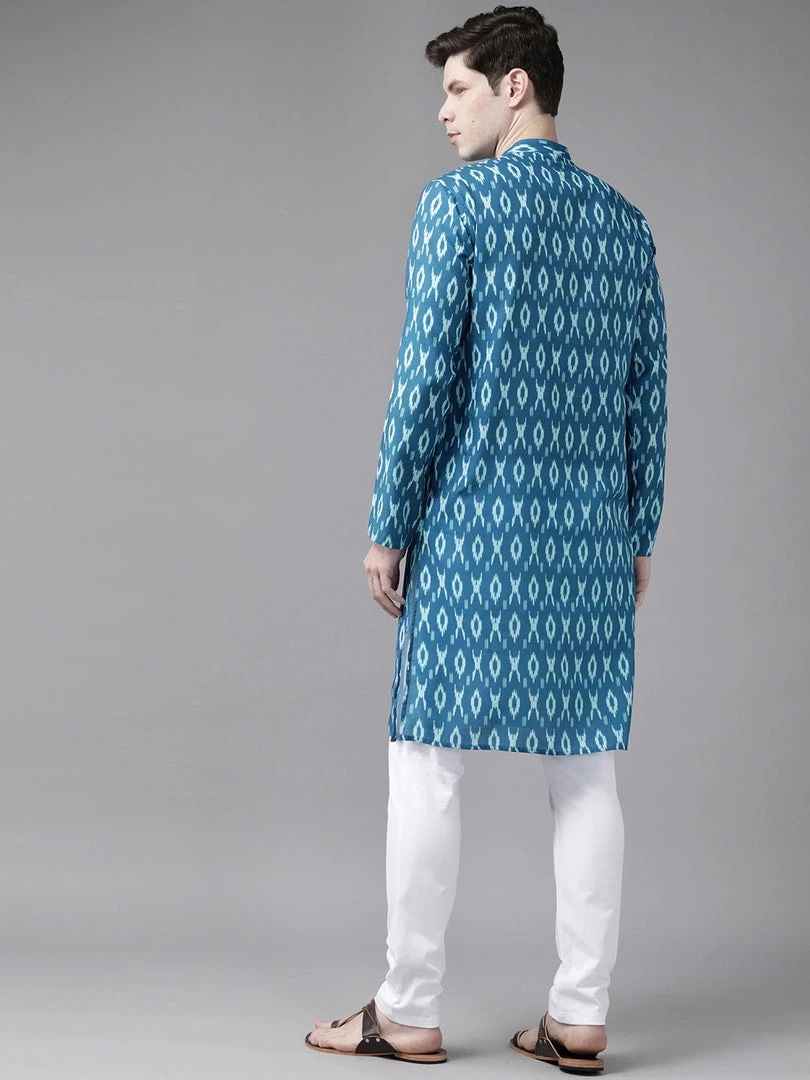 Turquoise ikkat printed straight knee length kurta, has a flat collar, long sleeves, button placket, side pocket, straight hem, and side slits.