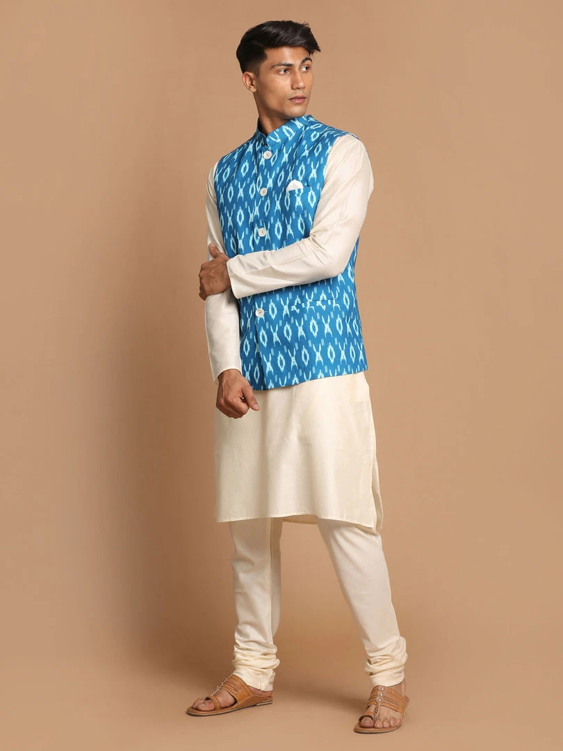 Traditional Ikkat Design Straight Hem Classic Nehru jacket with Cream Viscose Rayon Kurta Pyjama Set.