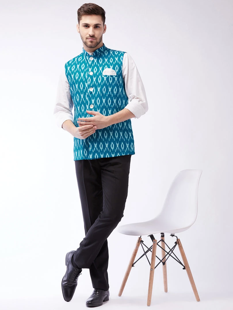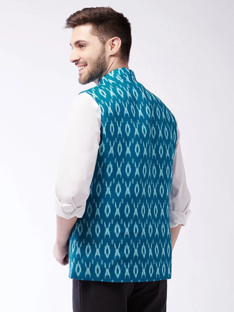 Traditional Ikkat Print Straight Hem Classic Nehru/Modi Jacket has a mandarin collar, sleeveless, a full button placket, three pockets. Comes with a pocket square.