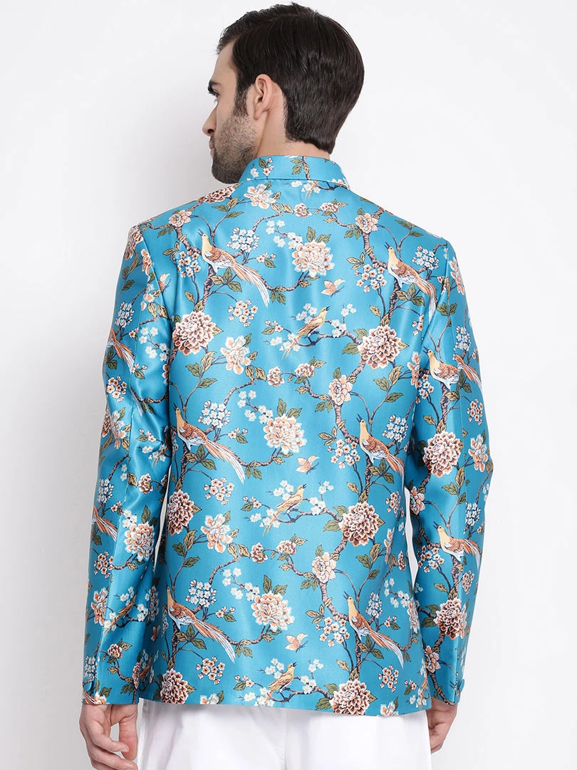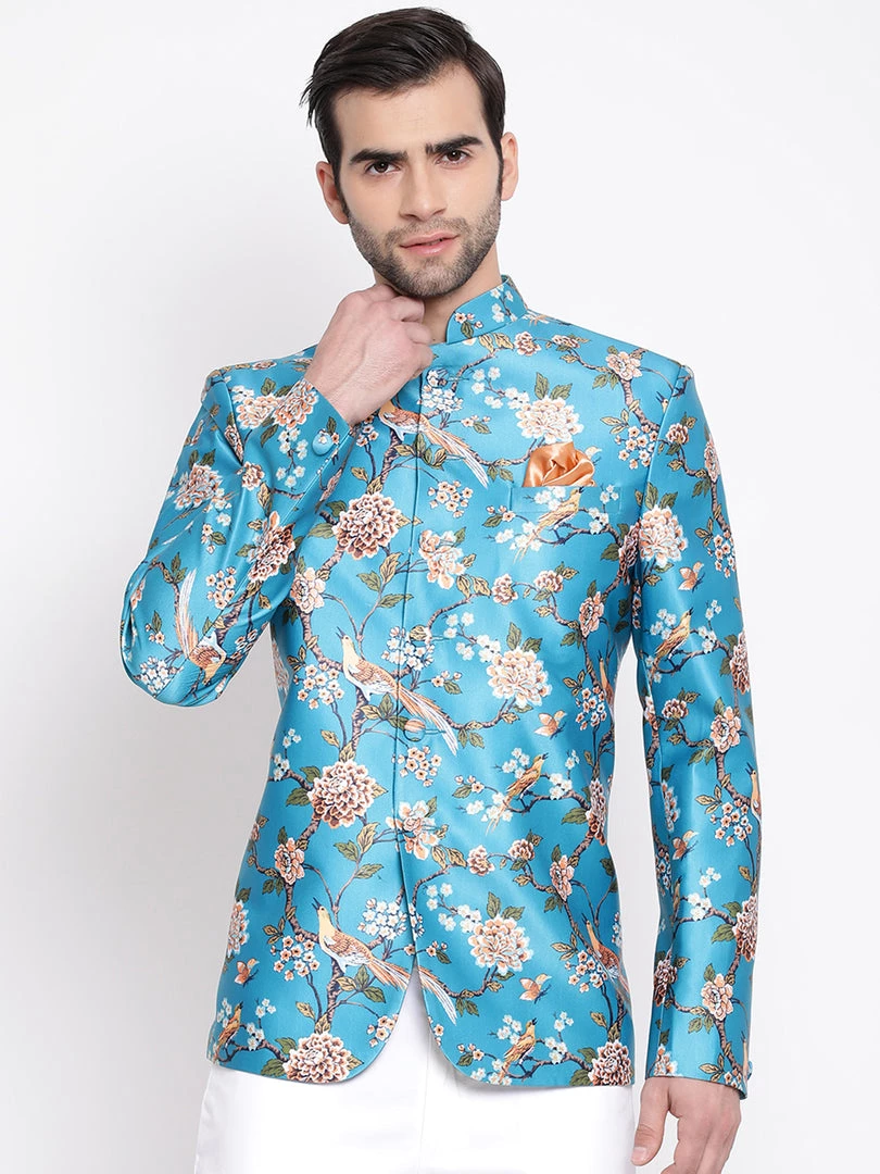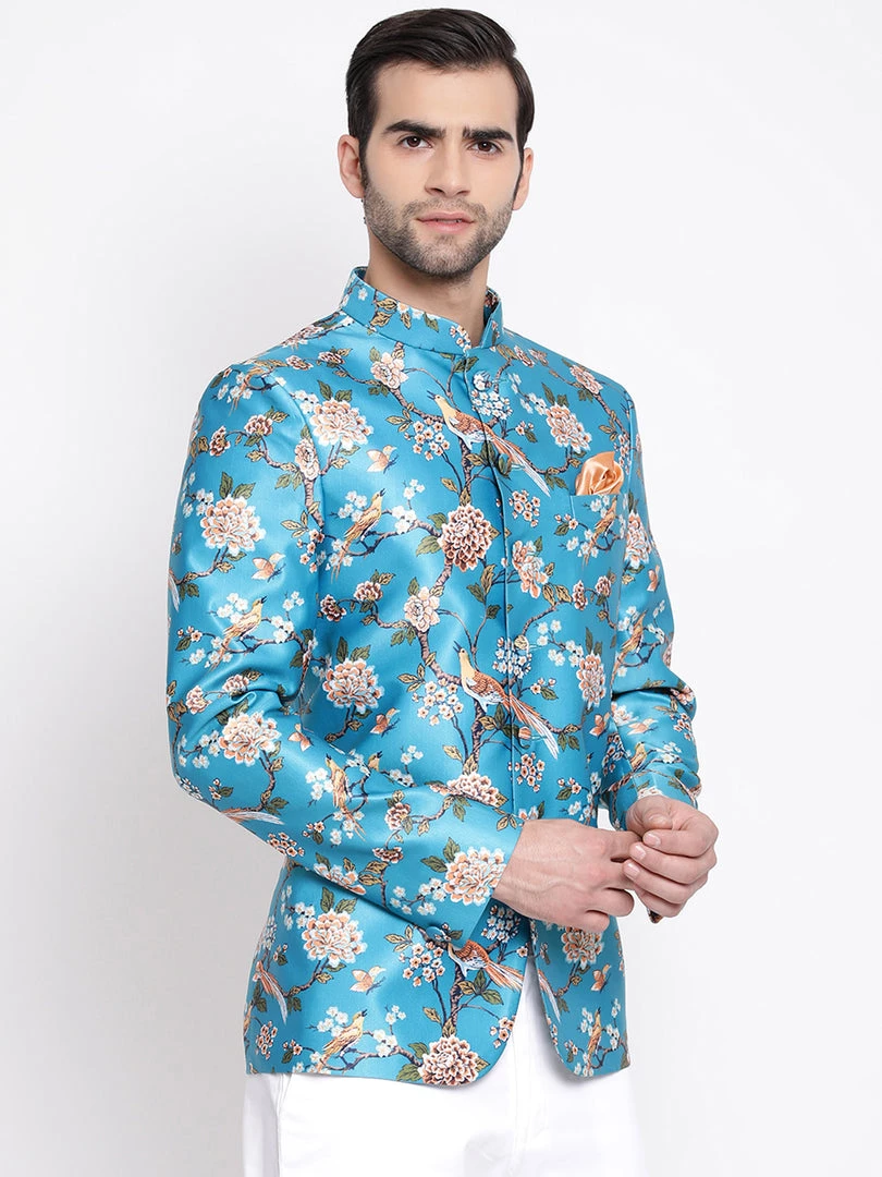 Turquoise base multicolor floral printed regular-fit jodhpuri, has a mandarin collar, long sleeves, a full button placket, one welt pocket, straight hem. Comes with pocket square
