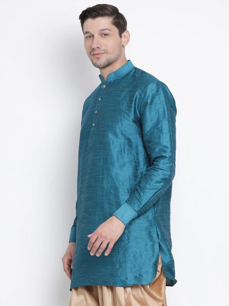 Turquoise straight above knee length pathani kurta, has a mandarin collar, long sleeves, button placket, curved hem, and side slits