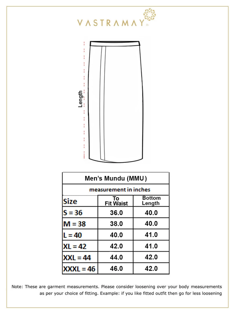 Vastramay’s south Indian style dhoti, also known as mundu/vesty. White full-length cotton mundu with gold border has pocket and velcro waistband with belt loops.