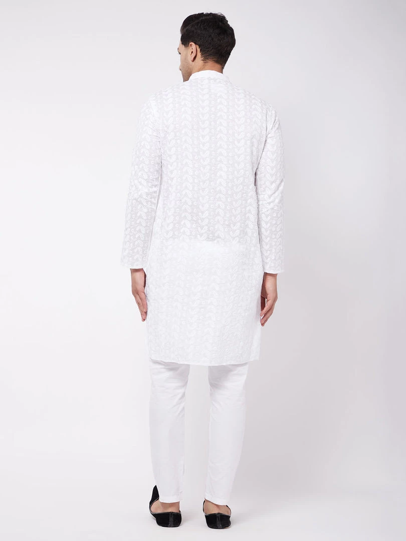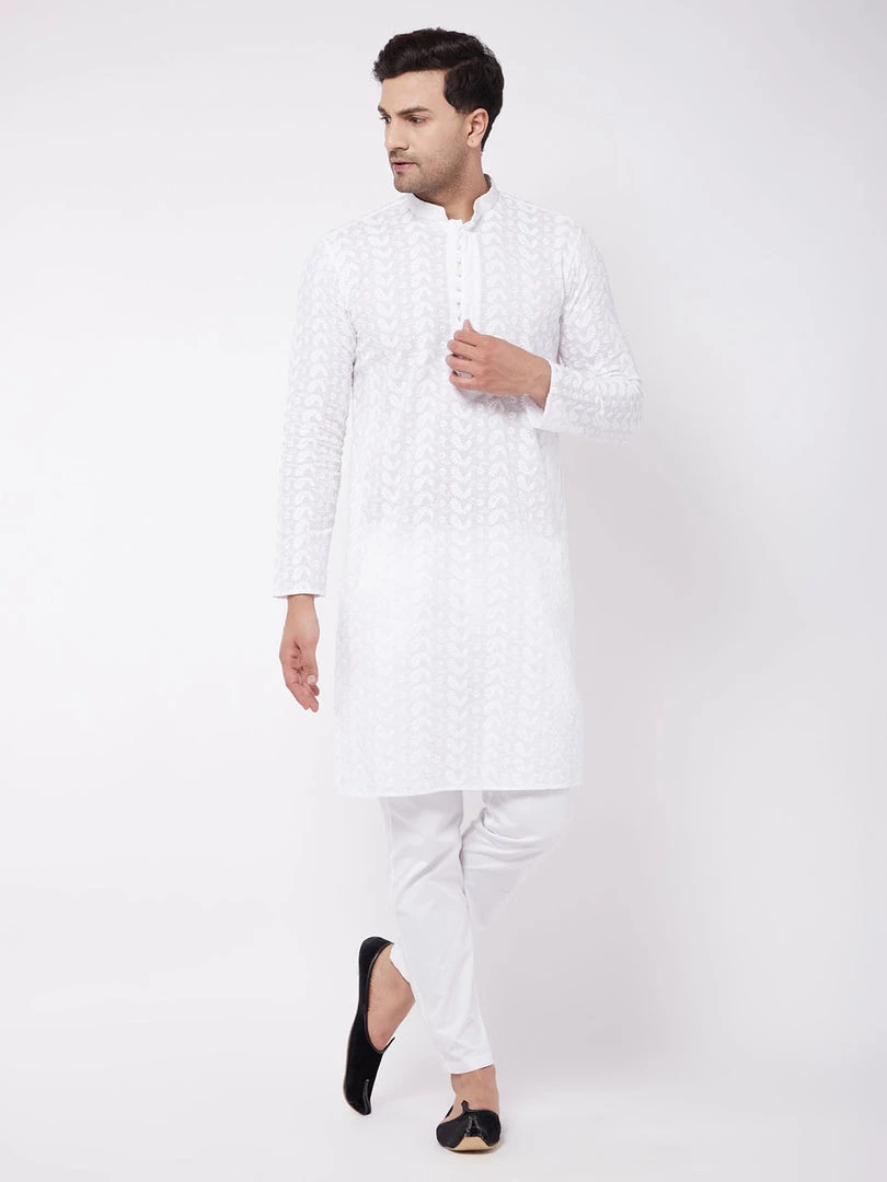 White chikankari straight knee-length kurta, has a mandarin collar, long sleeves, button placket, straight hem, and side slits