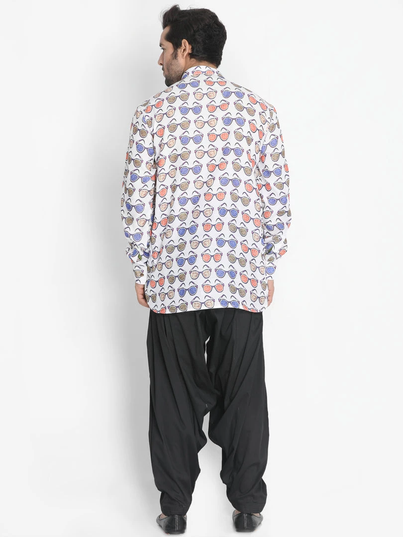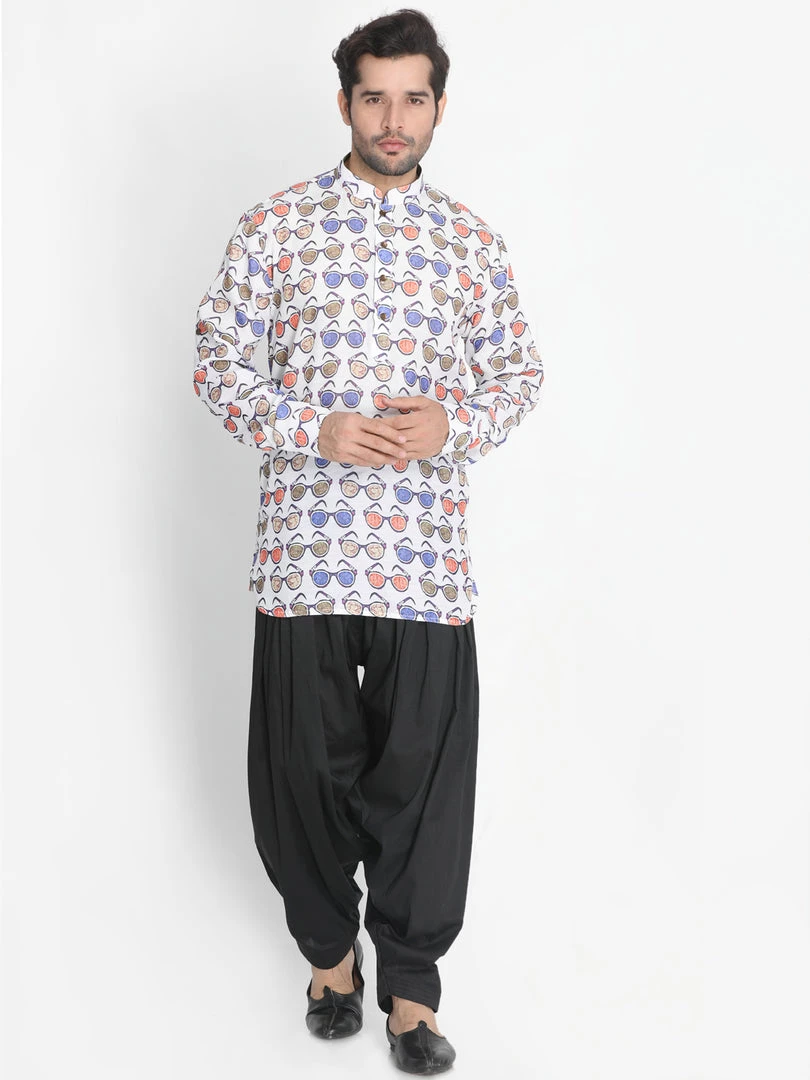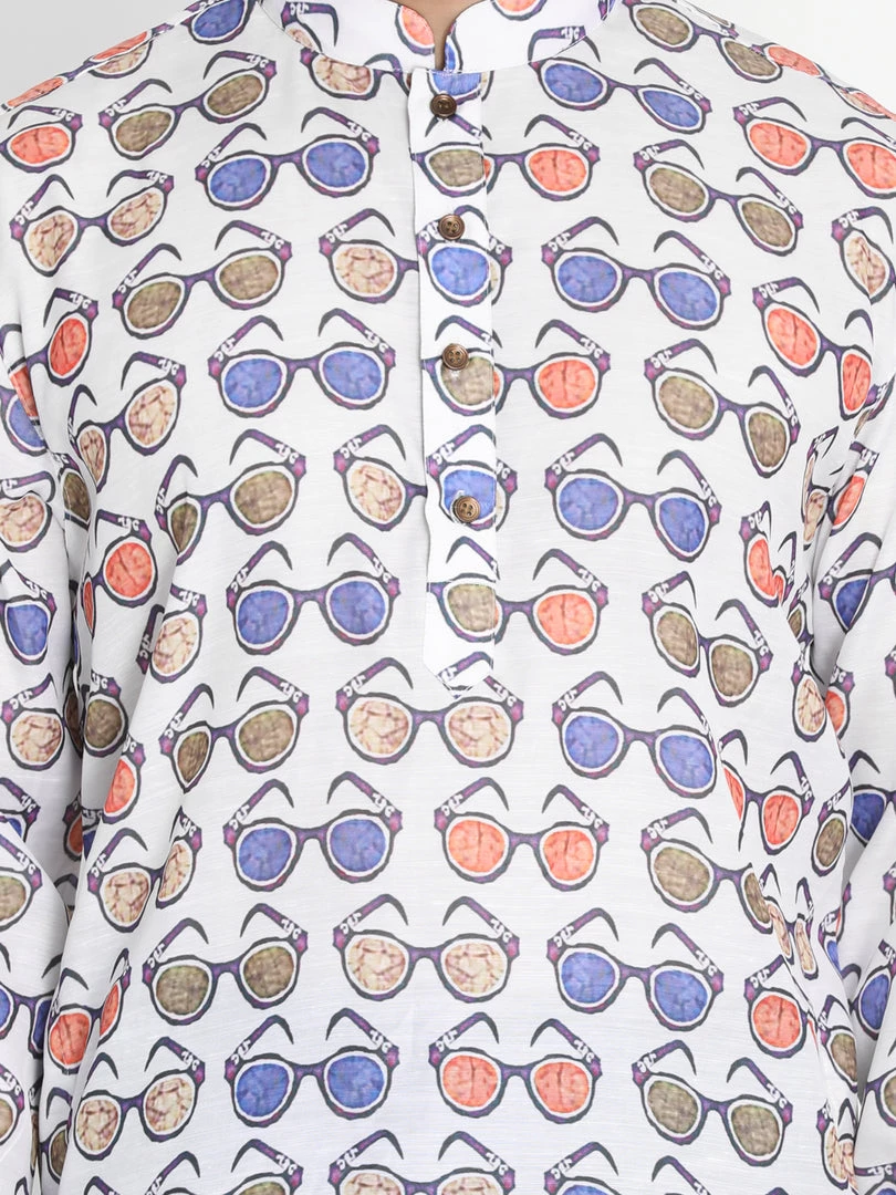 White sunglass printed above knee length pathani kurta, has a mandarin collar, long sleeves, button placket, curved hem, side slits