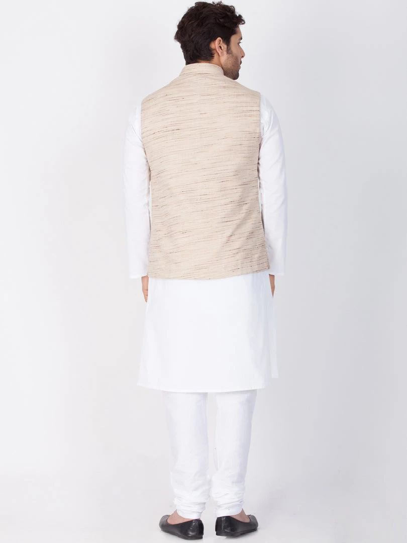 Beige woven Nehru jacket, has a mandarin collar, sleeveless, three pockets