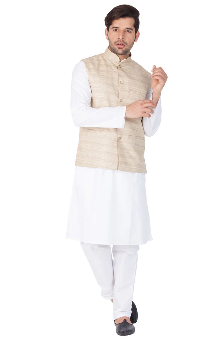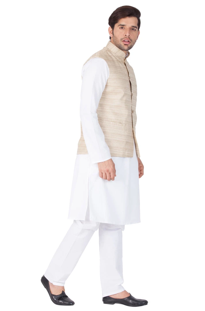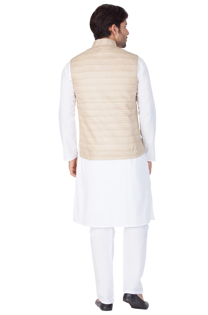 White solid kurta with solid pyjama and beige Nehru jacket