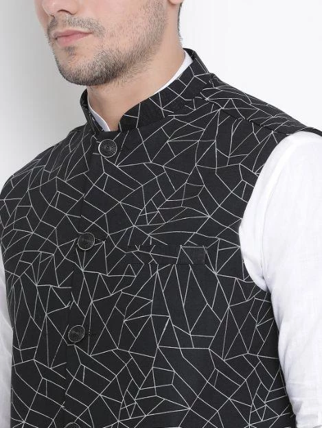 Black printed Nehru jacket, has a mandarin collar, a full button placket, sleeveless, a welt pocket