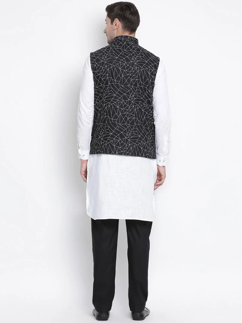 White solid kurta with solid pyjama and printed Nehru jacket