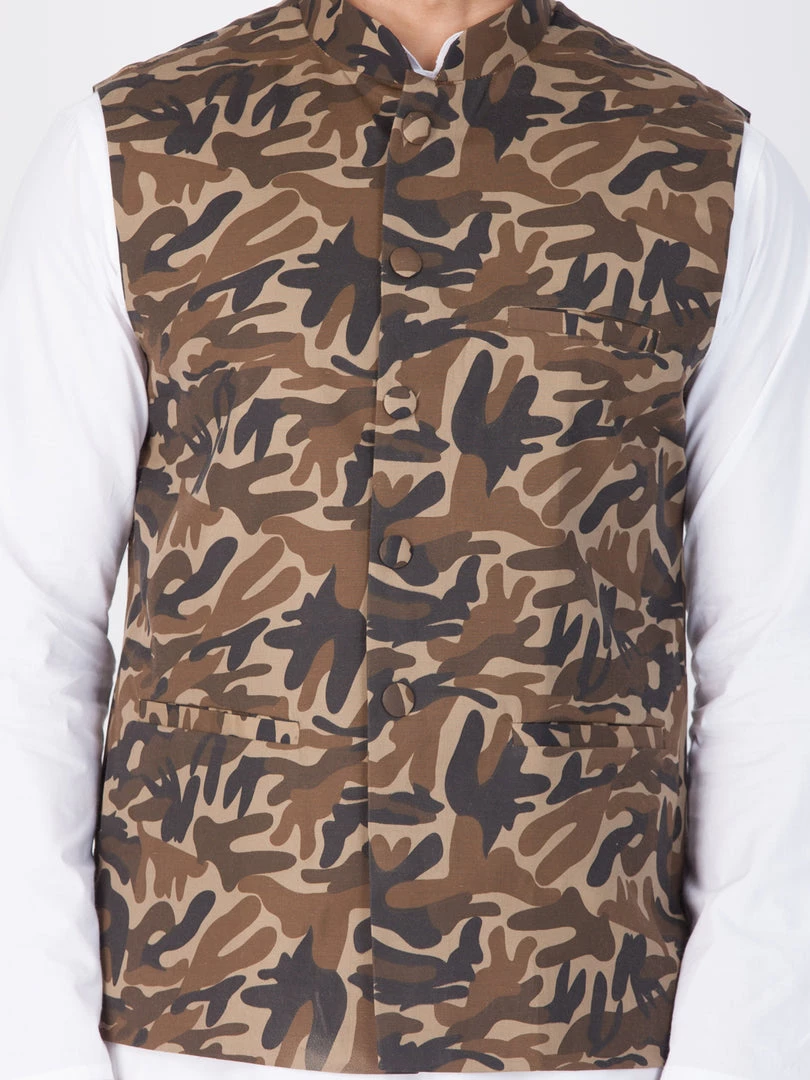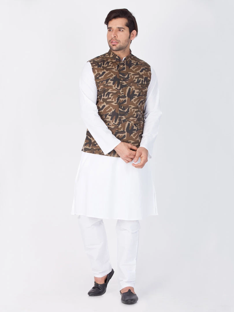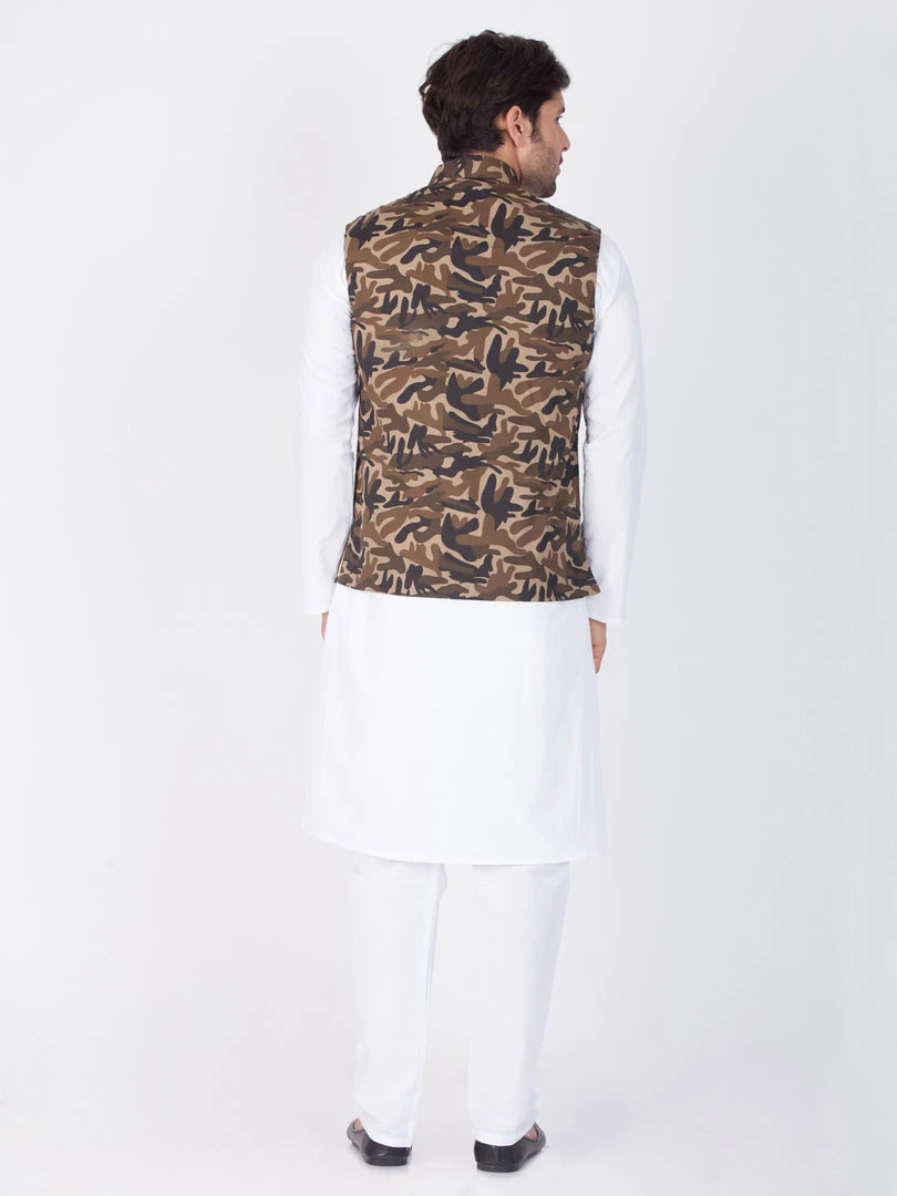 White solid kurta with solid pyjama and camouflage Nehru jacket