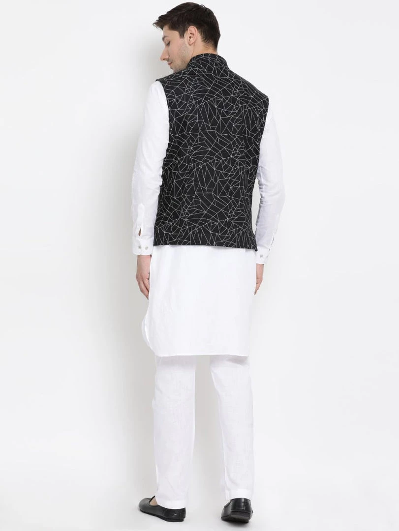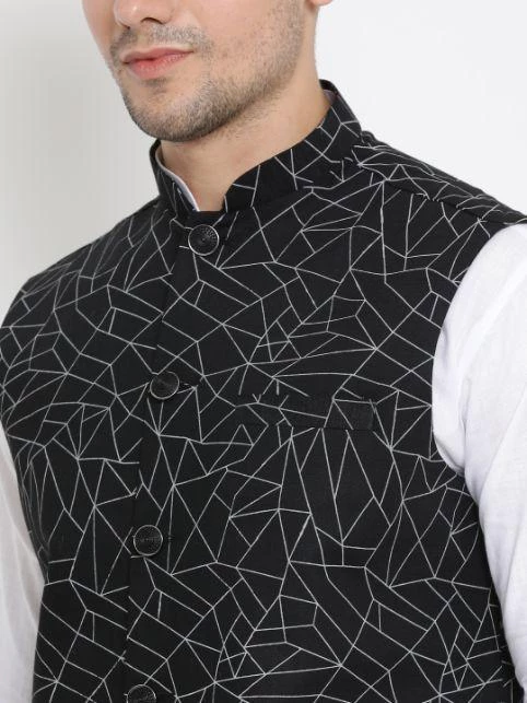 Black printed Nehru jacket, has a mandarin collar, a full button placket, sleeveless, a welt pocket