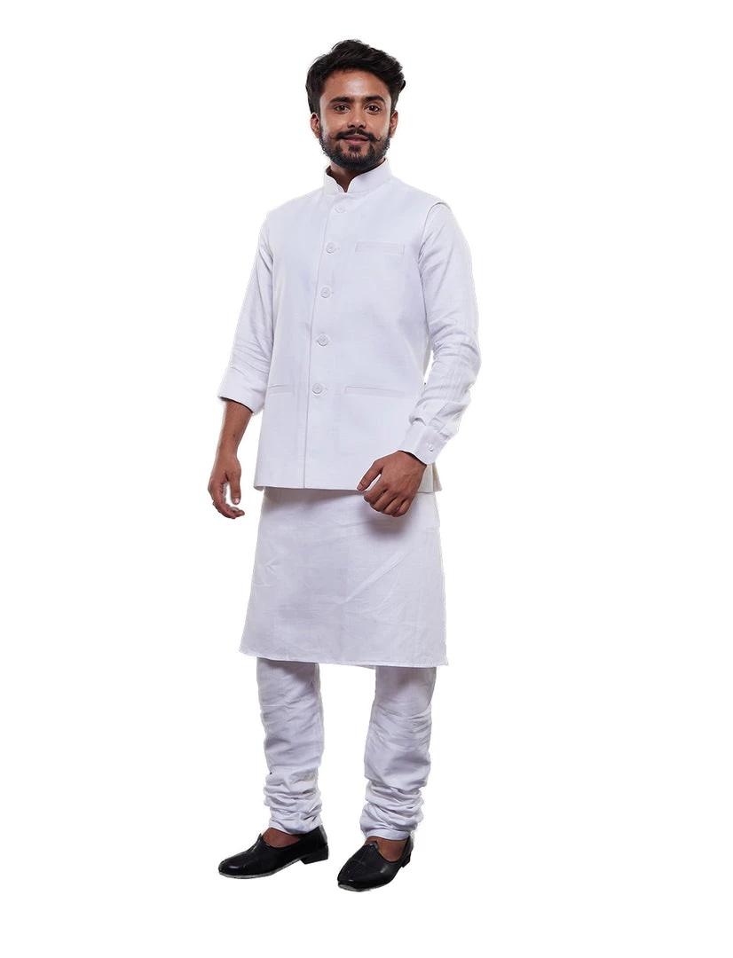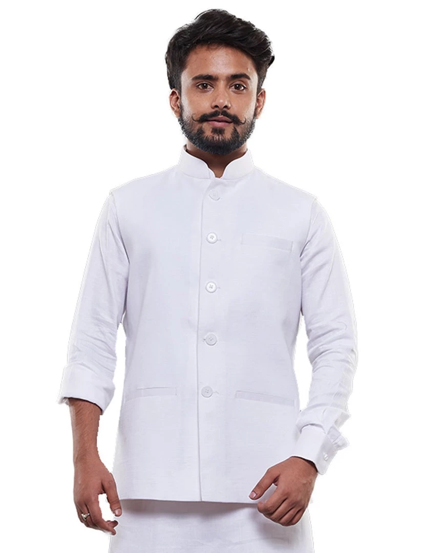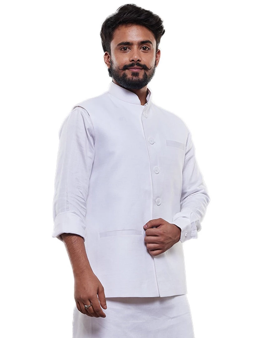 White Solid Nehru Jacket Regular style, Regular-length, has a Mandarin Collar, Sleeveless, Straight hem, and has three pockets