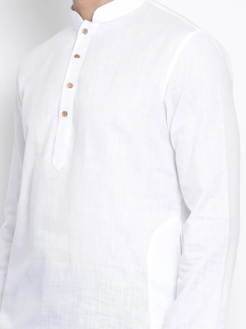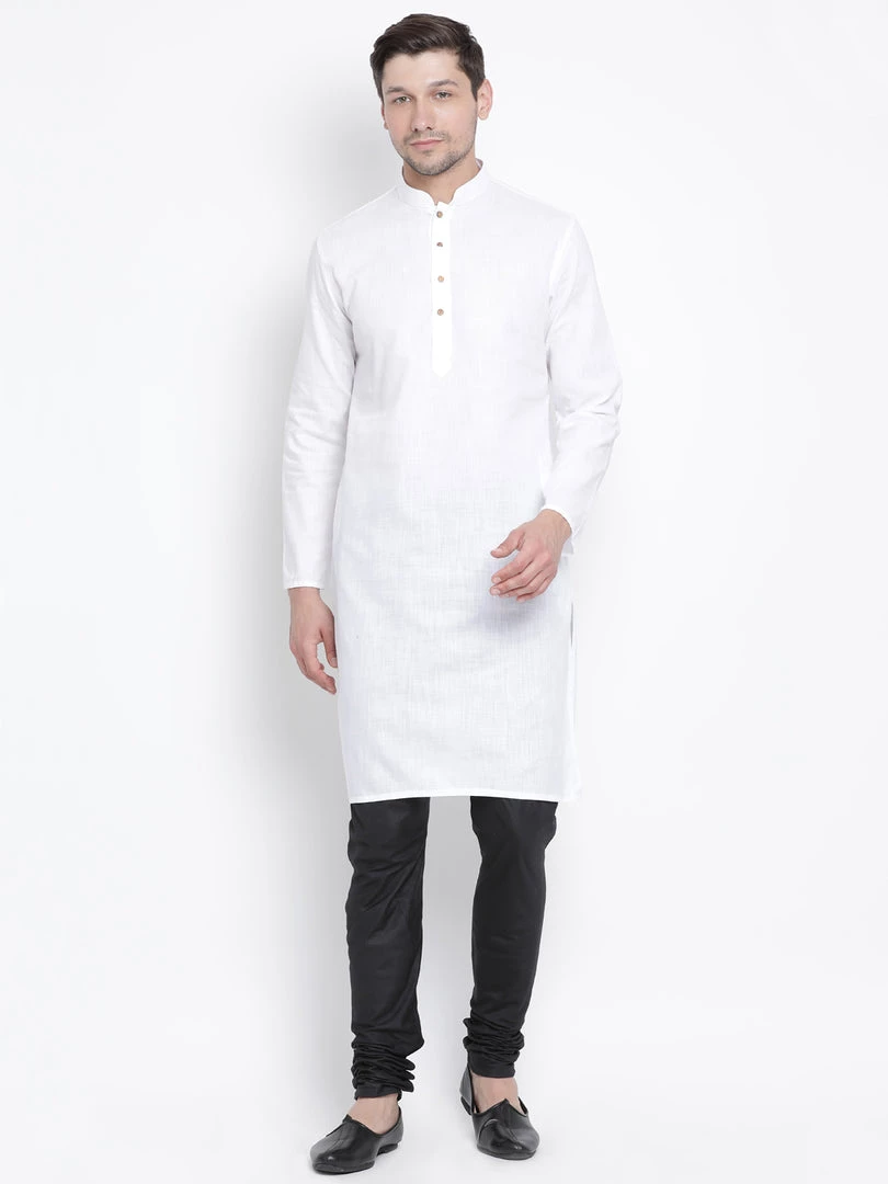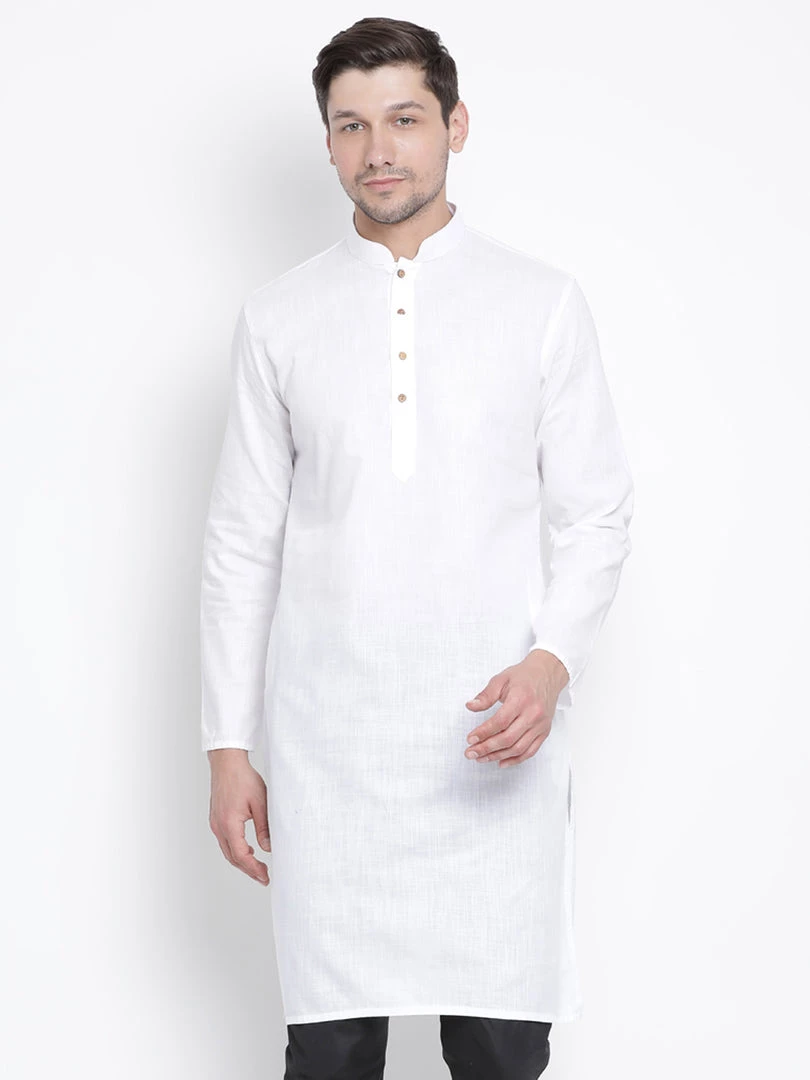 White solid straight kurta, has a mandarin collar, long sleeves, button placket, straight hem, and side slits