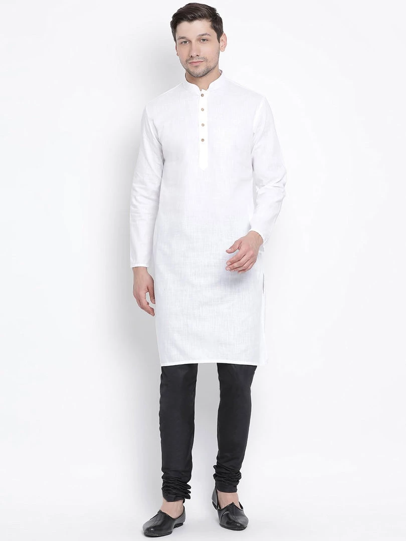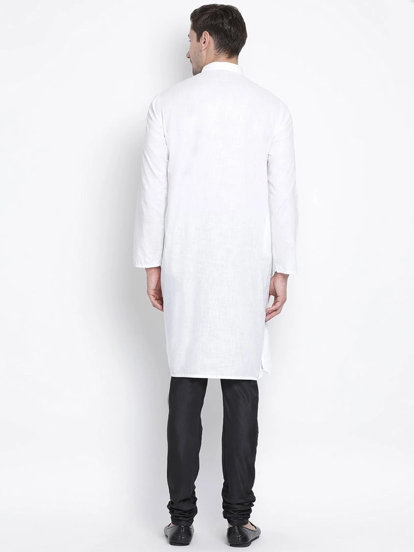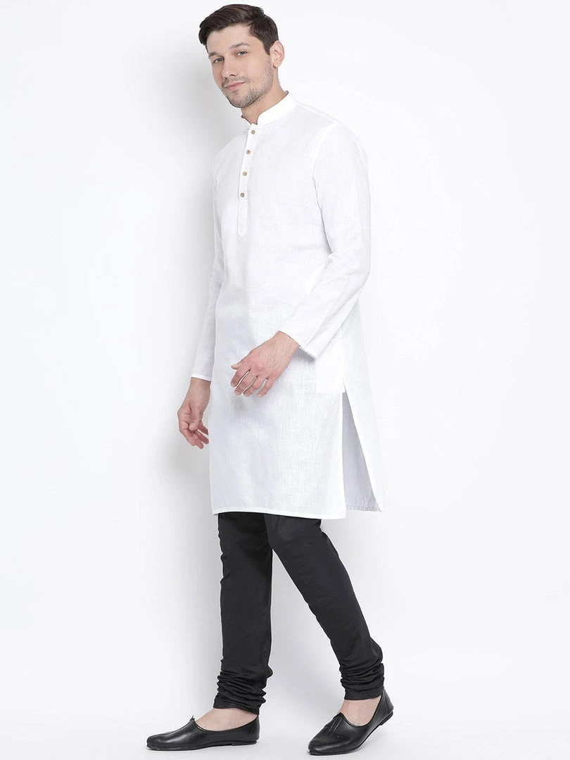 White solid straight knee length kurta, has a mandarin collar, button placket, long sleeves, straight hem