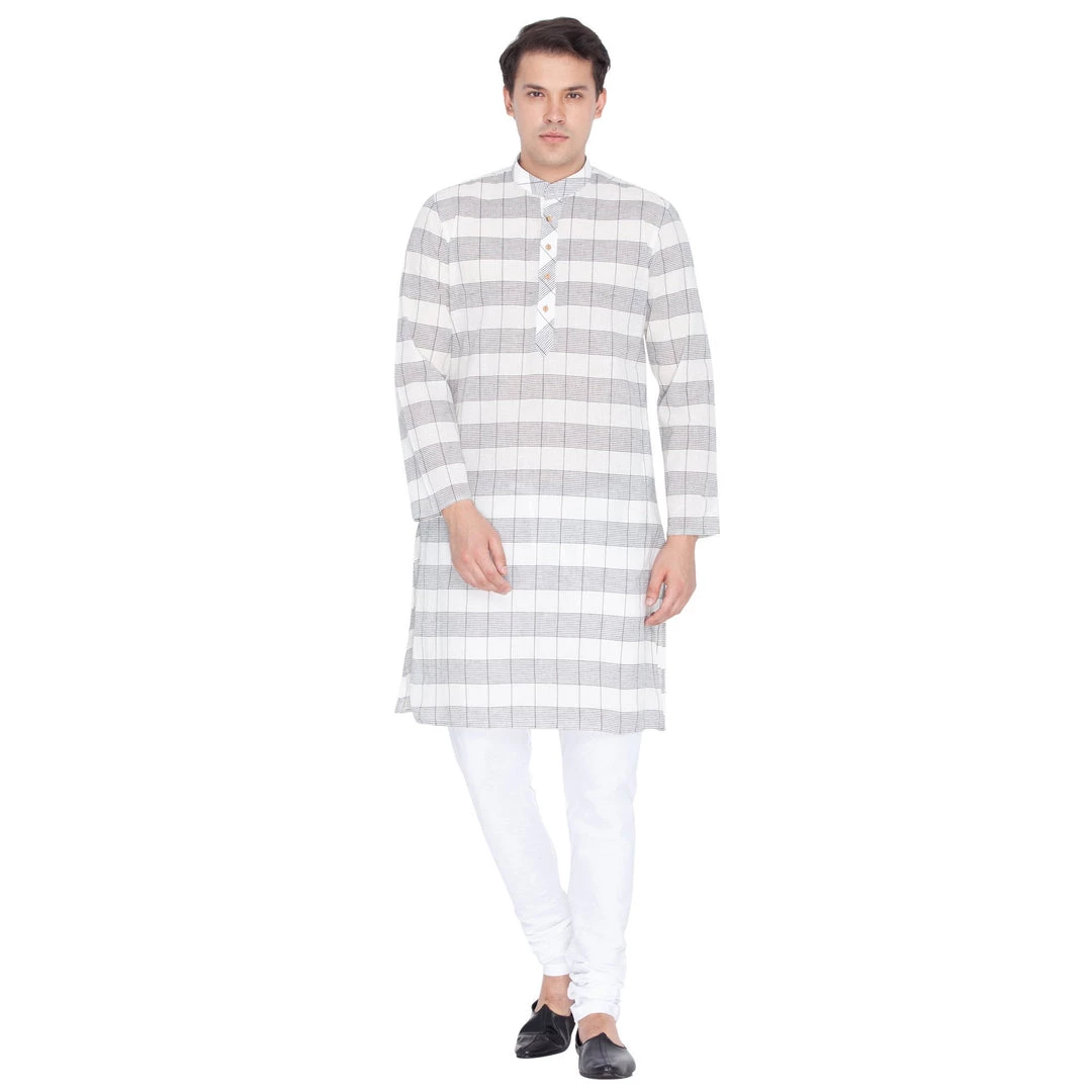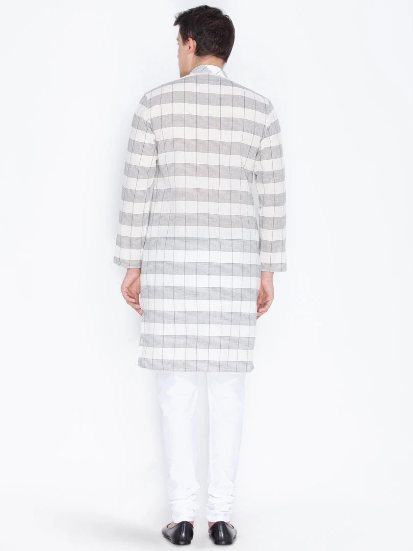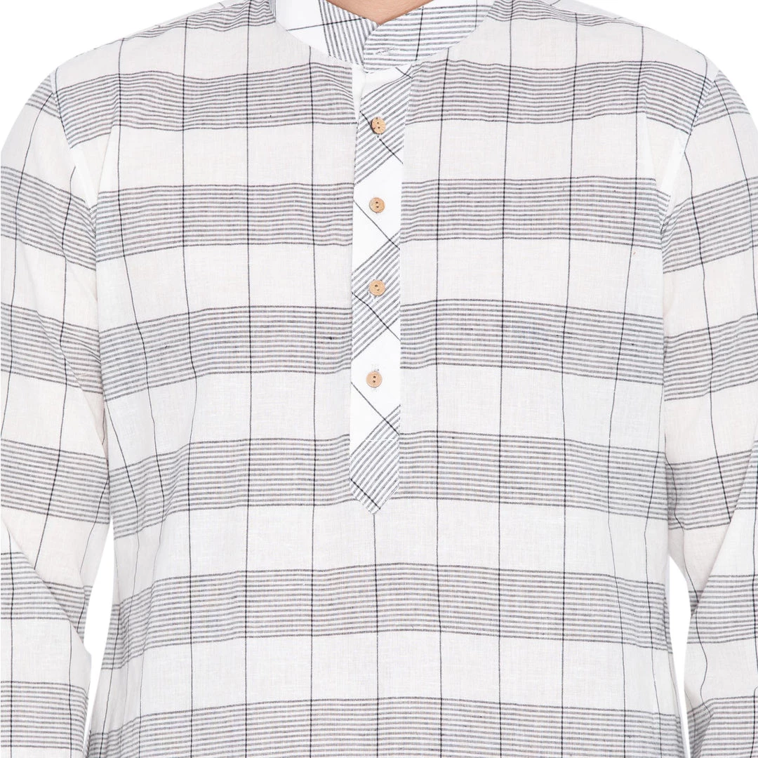 White and grey woven check straight knee length kurta, has a mandarin collar, long sleeves, button placket, straight hem