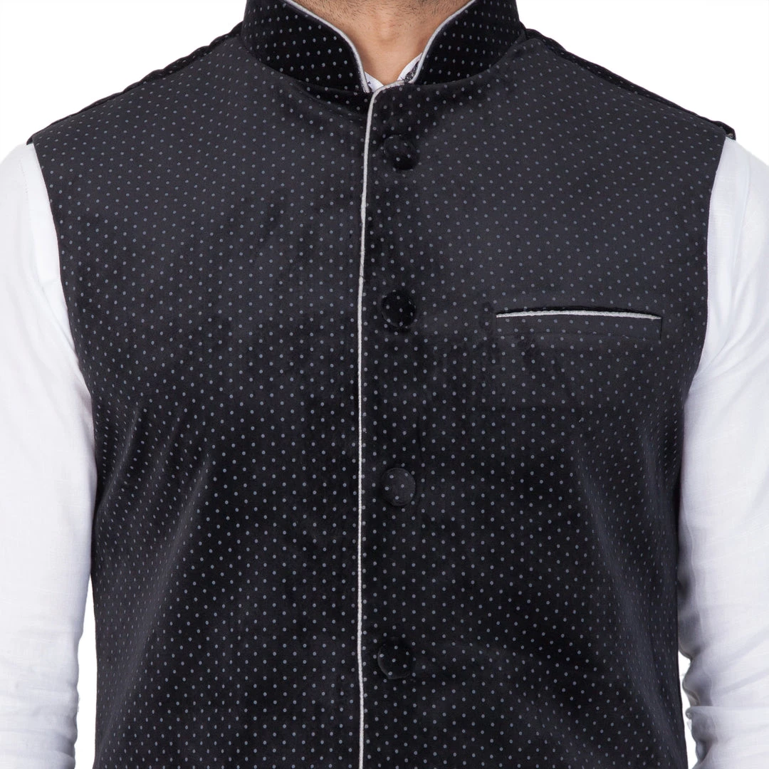 Black polka dot printed Nehru jacket, has a mandarin collar, sleeveless, full button placket, three welt pockets