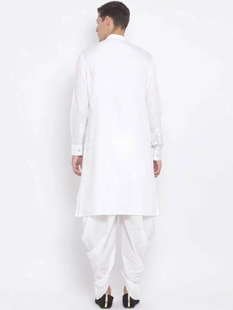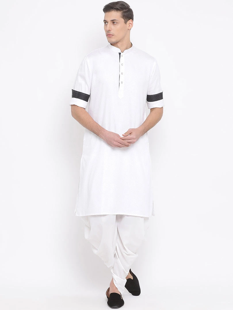 White polka dot knee length kurta, has a mandarin collar, long roll up sleeves with cuff, button placket, straight hem, side slits