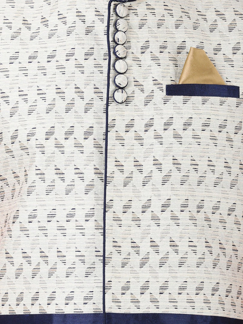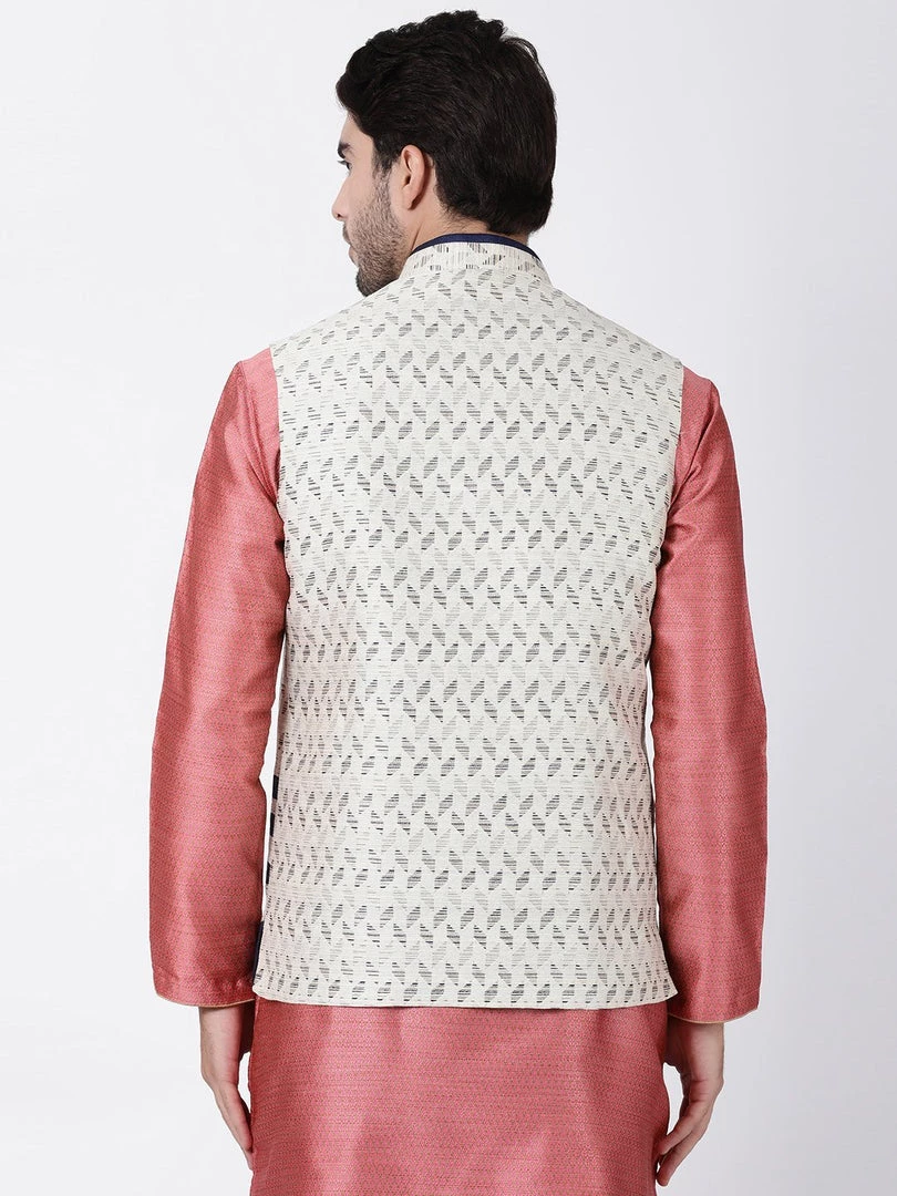 White Woven Nehru jacket, Sleeveless, Straight hem, has a Mandarin Collar, one pocket with a pocket square.