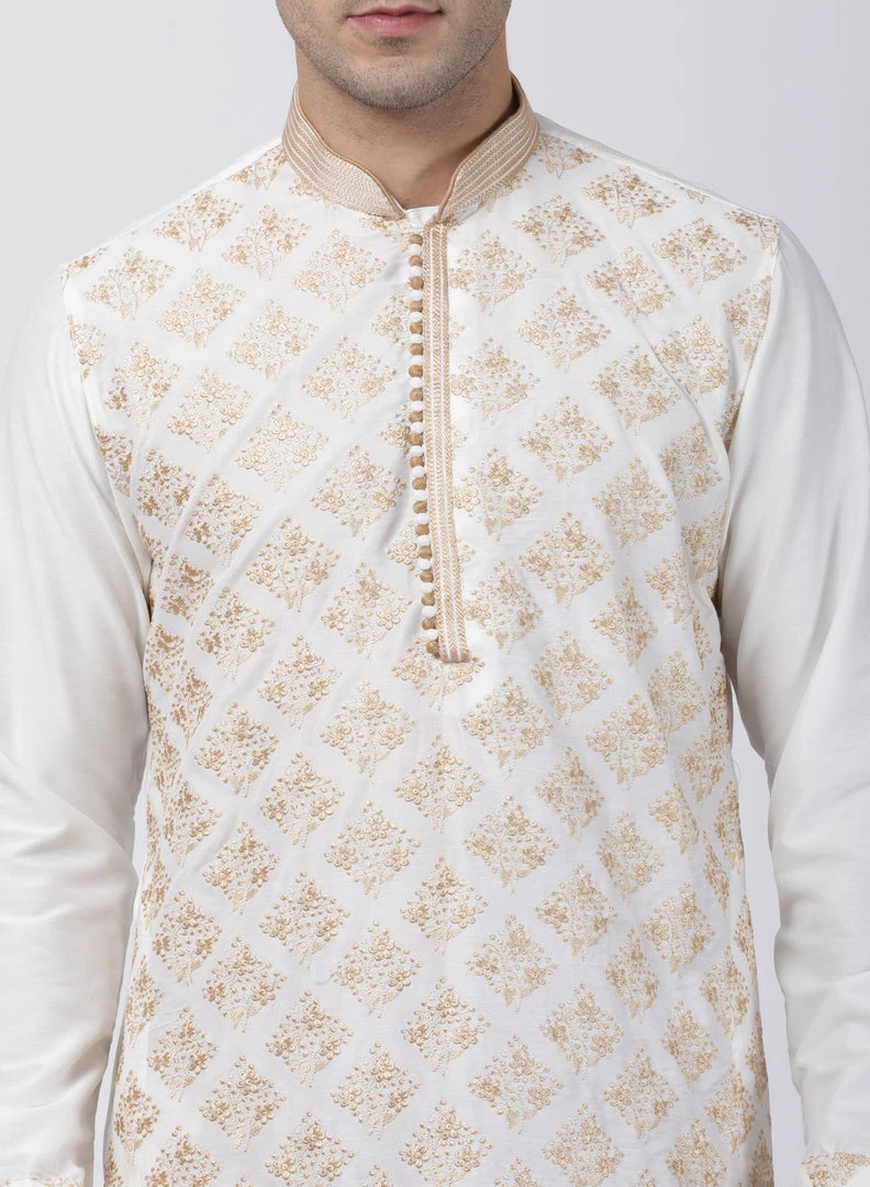 White and gold toned embroidered straight knee length kurta, has a mandarin collar, button placket, long sleeves, straight hem