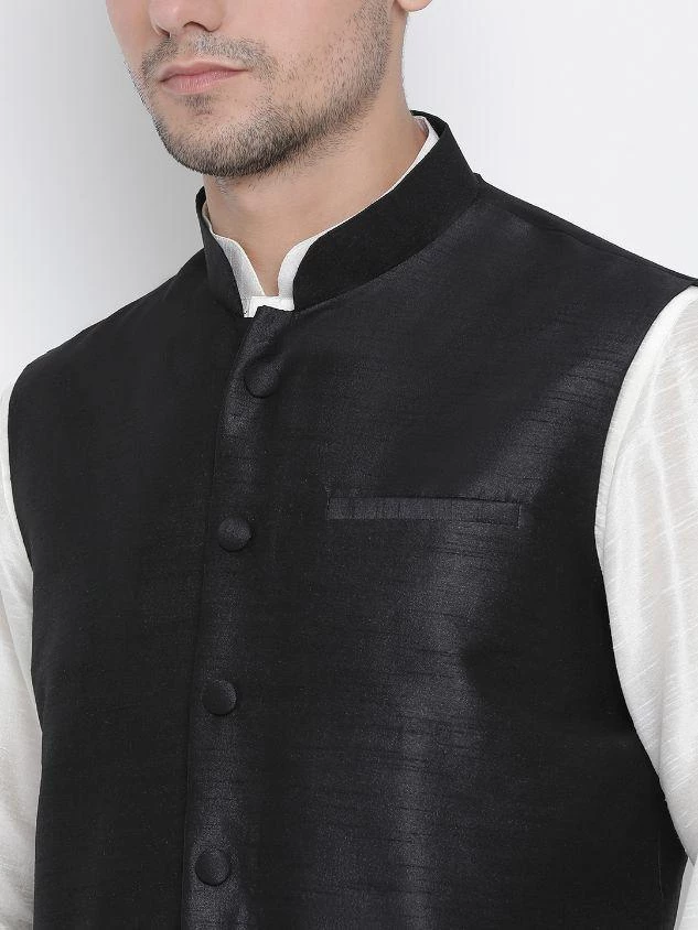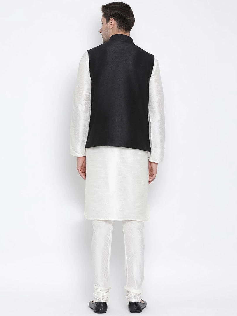 Off white solid kurta with solid churidar and black Nehru jacket