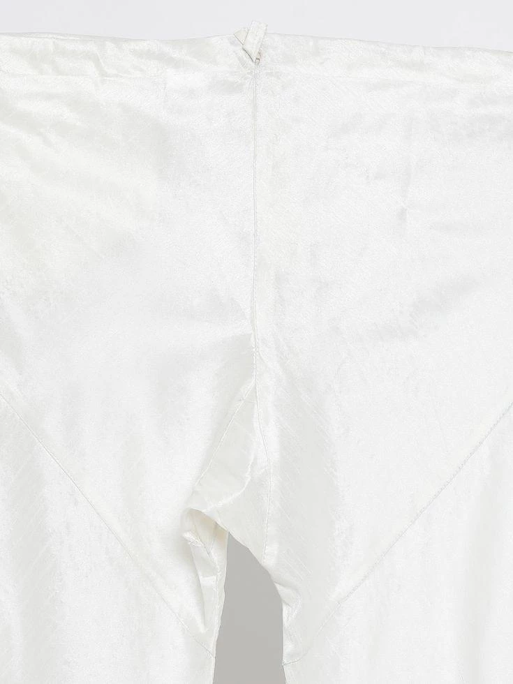 Off white solid straight knee length kurta, has a mandarin collar, long sleeves, straight hem