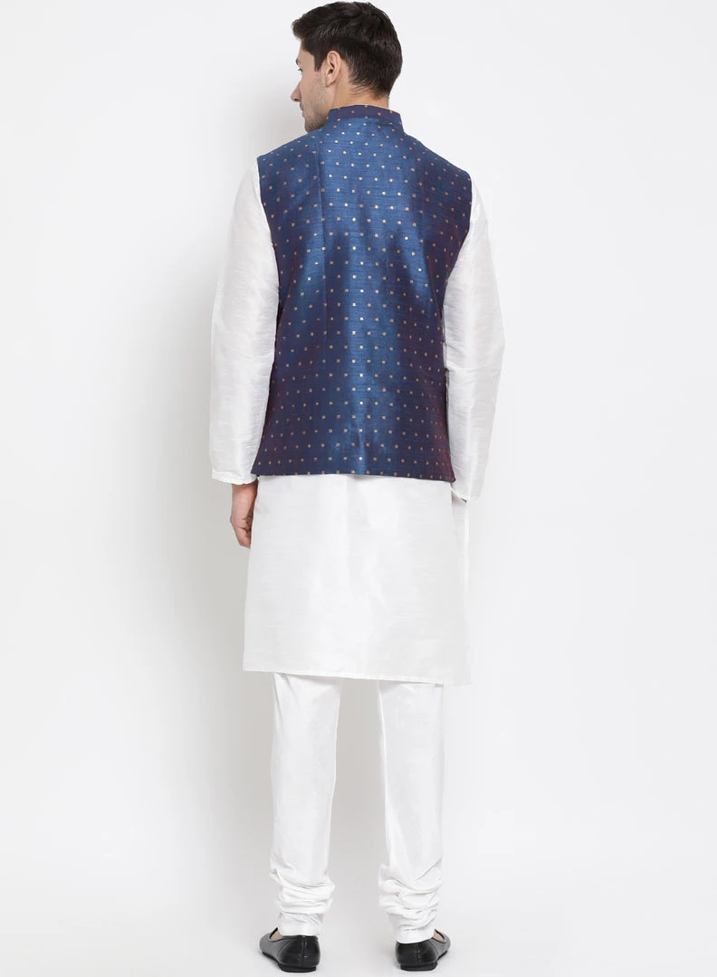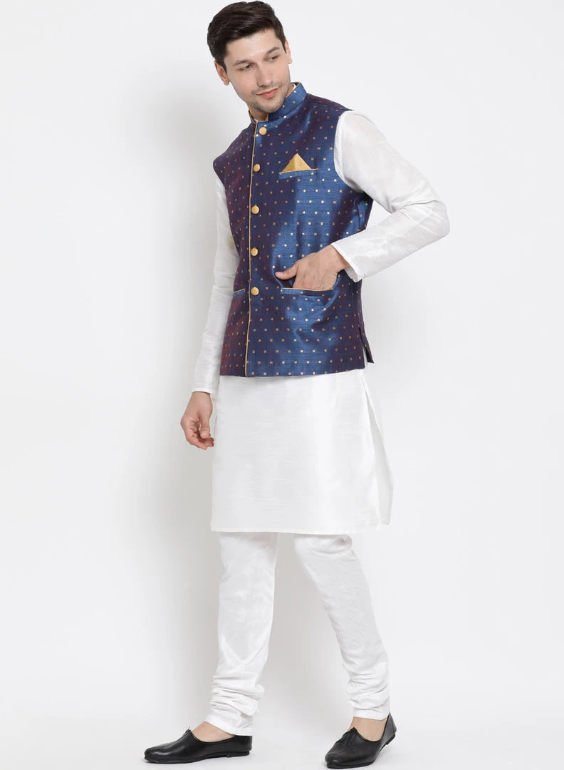 Blue and golden woven Nehru jacket, has a mandarin collar, sleeveless, three pockets. Comes with pocket square