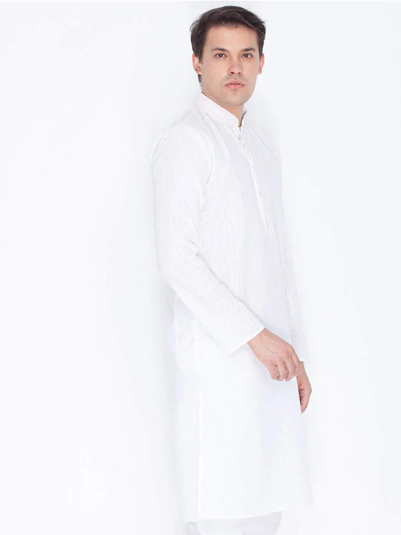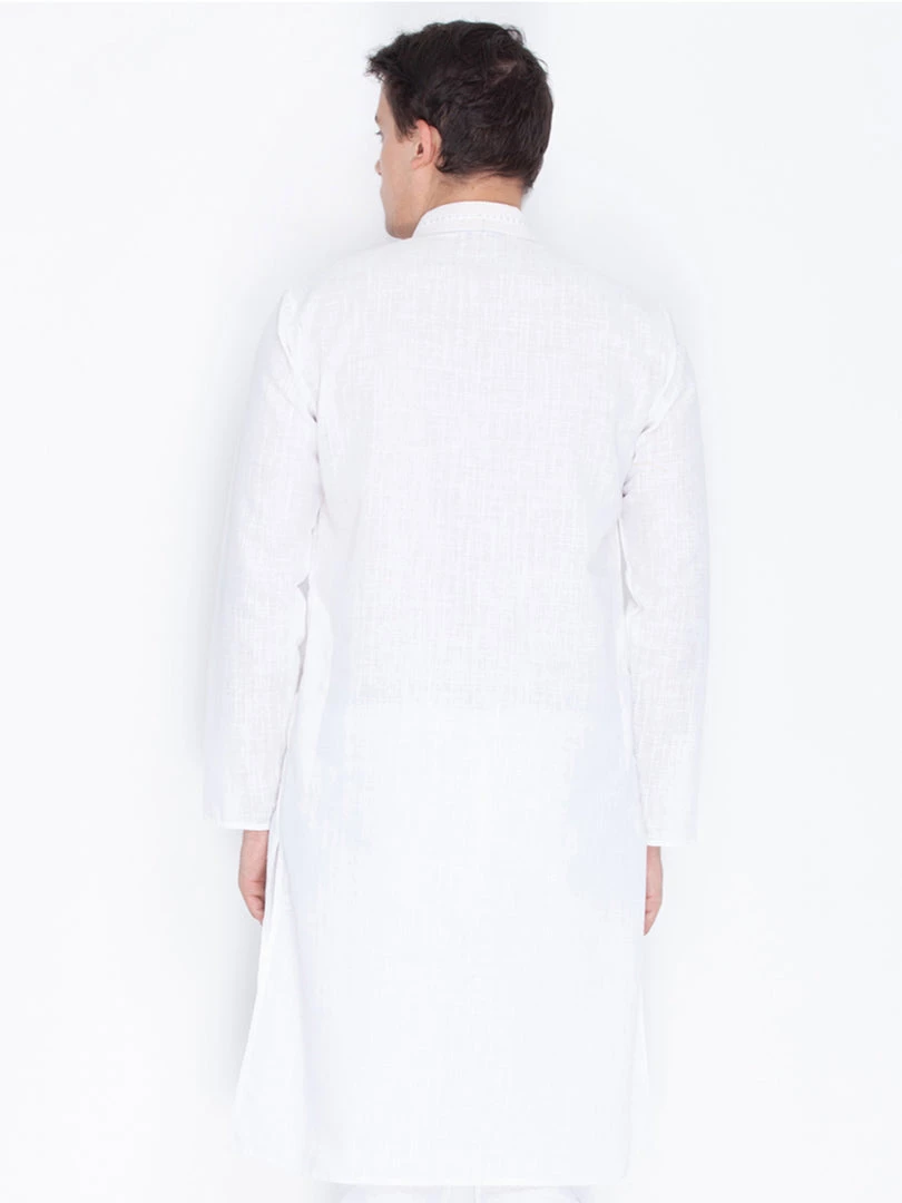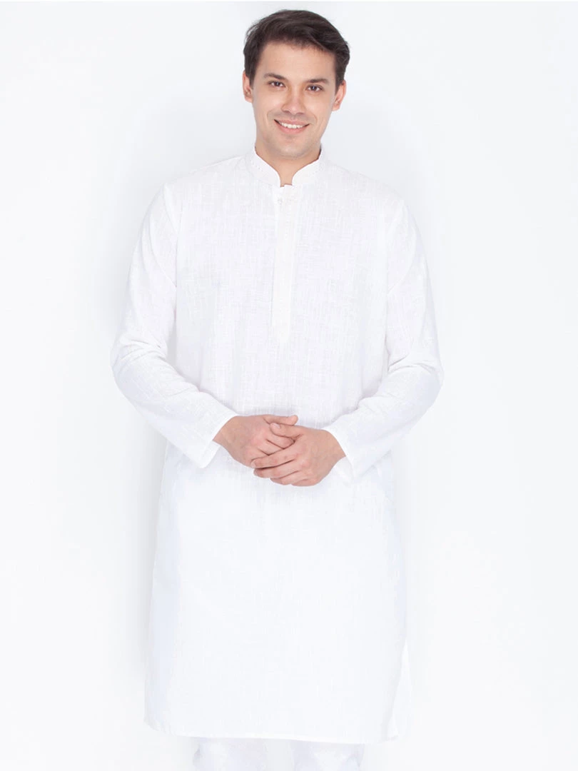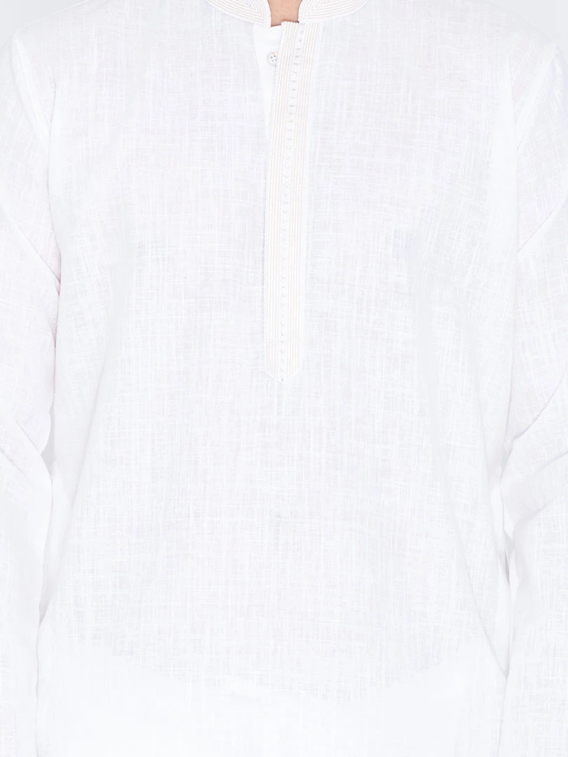 White solid straight knee-length kurta, has a mandarin collar, long sleeves, straight hem.