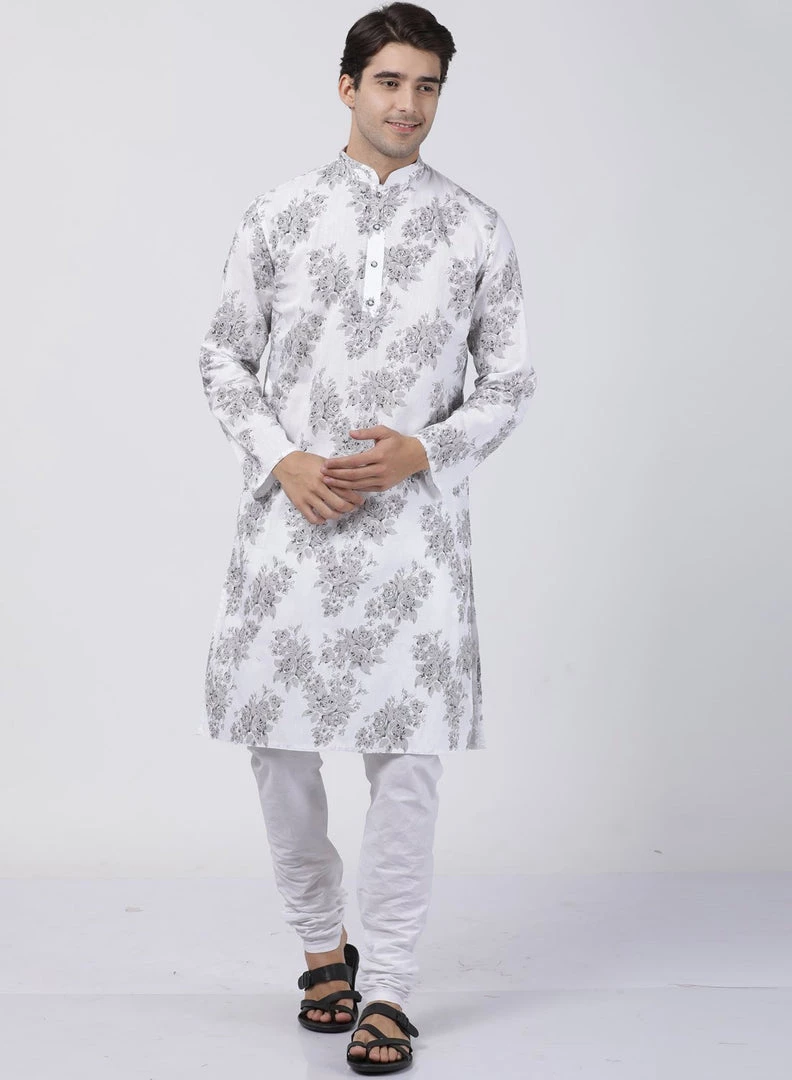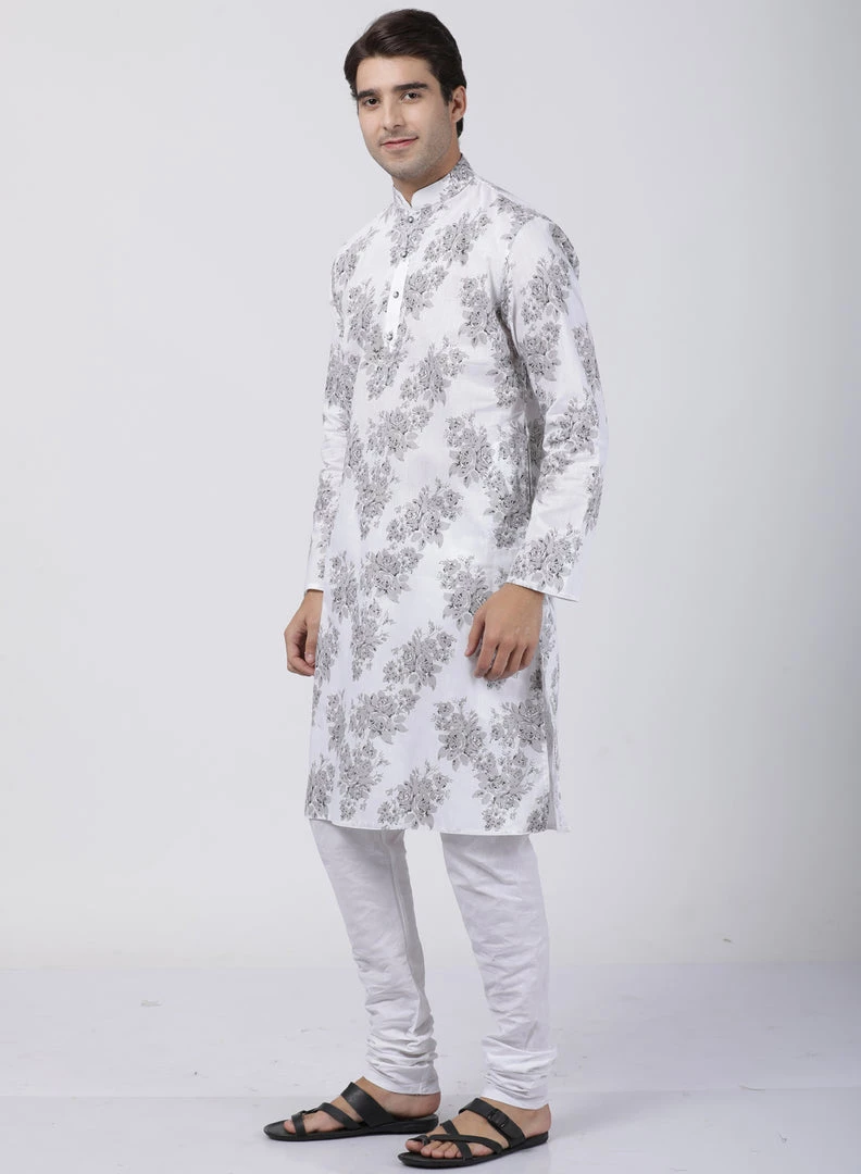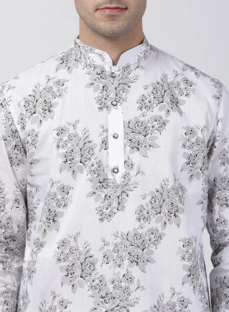 White and grey printed straight knee-length kurta, has a mandarin collar, button placket, long sleeves, straight hem