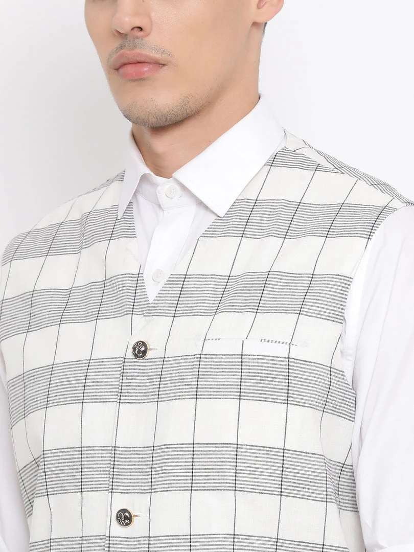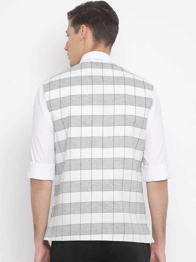 White and grey checked regular-fit Nehru jacket, has a V neck, sleeveless, a full button placket and straight hem