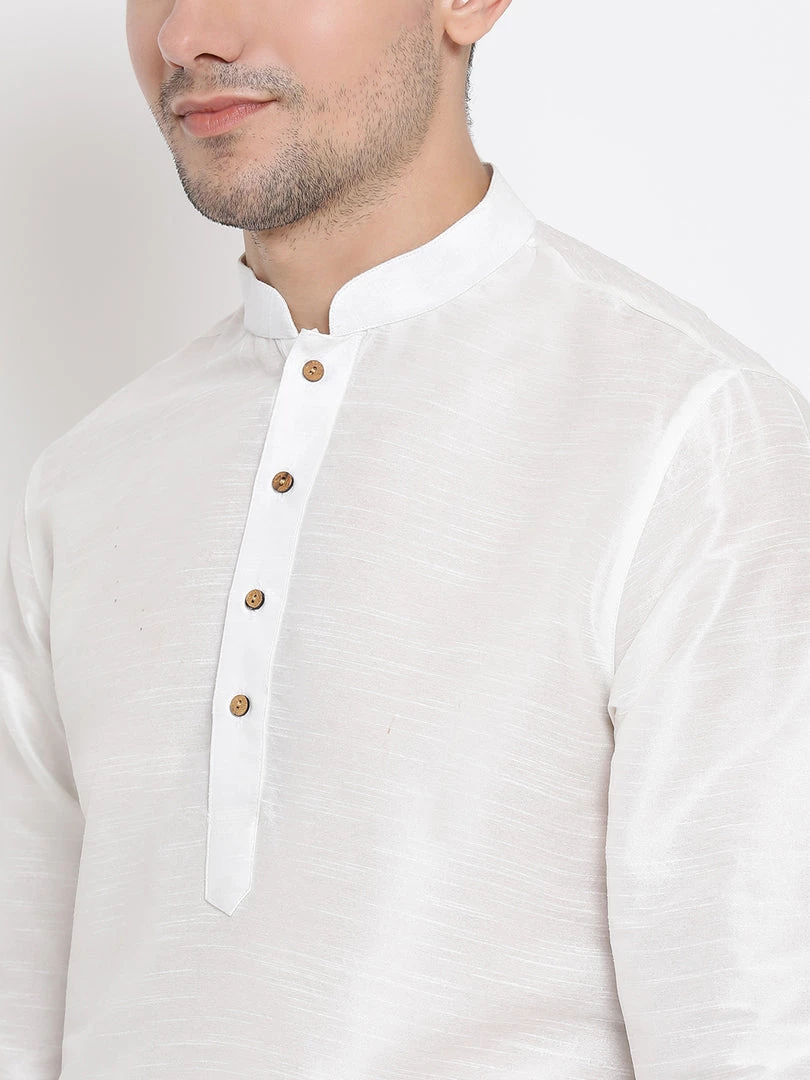 White solid above knee length kurta, has a mandarin collar, long sleeves, button placket, curved hem, side slits