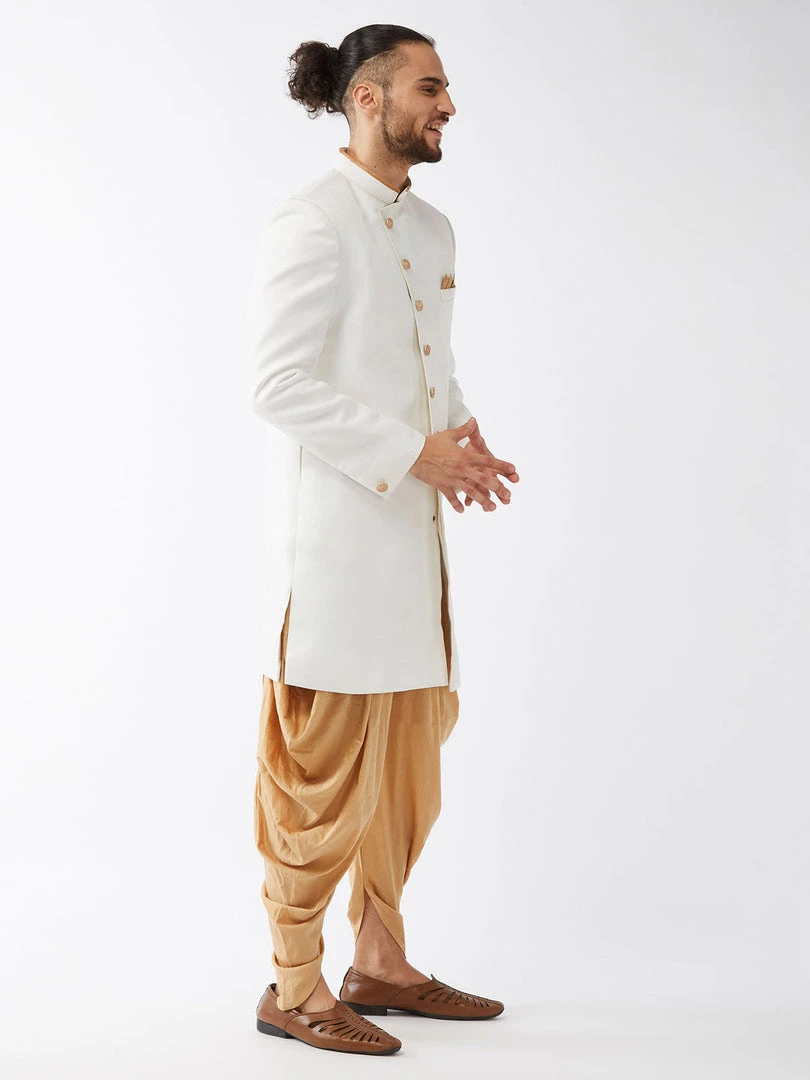 White solid sherwani with gold toned solid dhoti pant